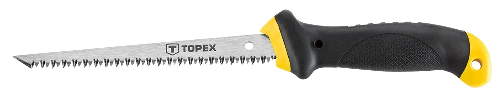 Ножівка по гіпсокартонним плитам TOPEX довжиною полотна 150 мм. Має товстіше та твердіше полотно у порівнянні з іншими пилами та ножівками, та призначена для вирізання отворів у гіпсокартонних плитах. Полотно виготовлене з високоякісної загартованої сталі. Обобічне гостріння зубів знижує супротив під час різання. Ергономічна ручка з пластику дозволяє з прецизійною точністю направляти полотно, натомість протиковзна накладка попереджає висковзуванню з руки, тим самим запевняючи високий комфорт праці. Марка TOPEX адресована майстрам, які займаються дрібним ремонтом.