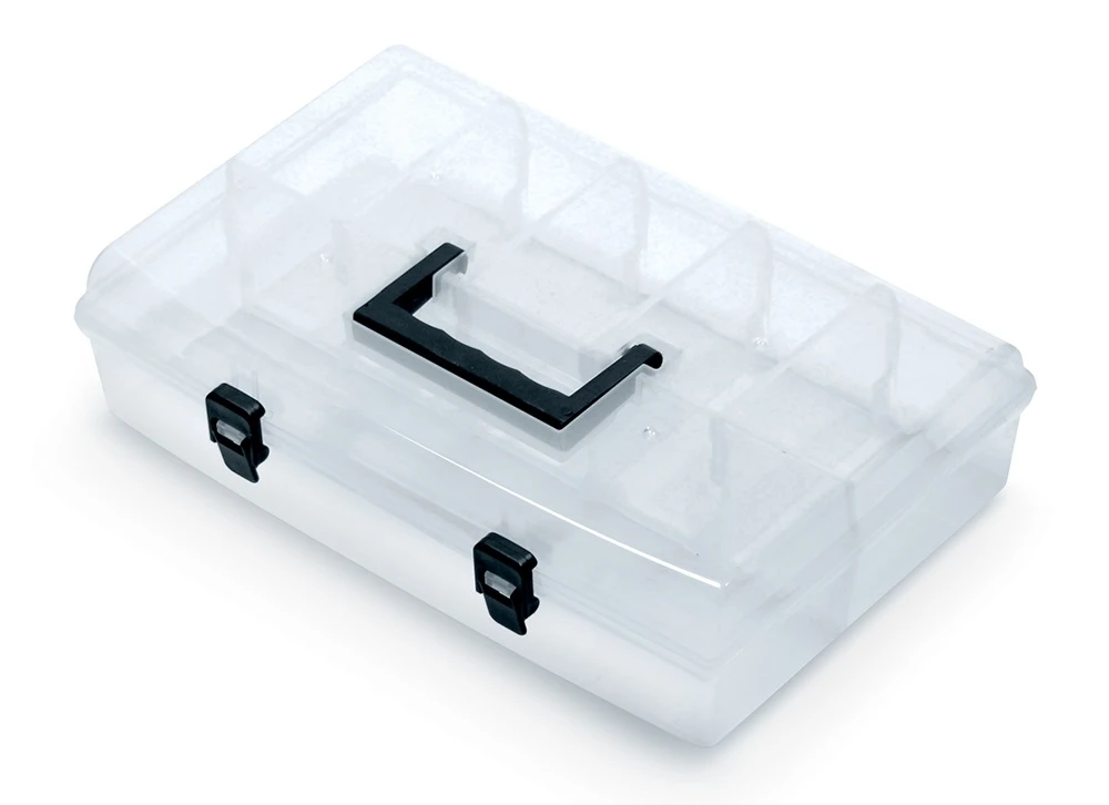 Органайзер розміром 35.9x23.8x8.5 см з 5 фіксованими відділеннями, добре підходить для зберігання інструментів або дрібних аксесуарів. Прозора кришка та корпус із поліпропілену забезпечують легкий огляд вмісту. Ергономічна ручка у кришці та міцні засувки гарантують зручне транспортування та надійність.