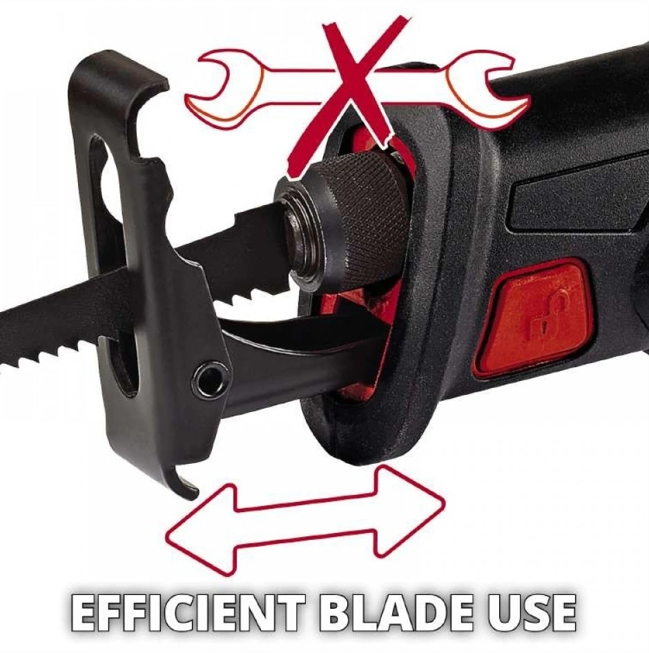Акумуляторна шабельна пила Einhell TE-AP 18/22 Li Kit є пристроєм сімейства Einhell Power X-Change. Акумулятор і зарядний пристрій Power X-Change можуть використовуватися для всіх пристроїв сімейства Power X-Change. Зміна пильного полотна без використання додаткового інструменту дозволяє економити цінний час. Підошву також можна відрегулювати без застосування інструментів.