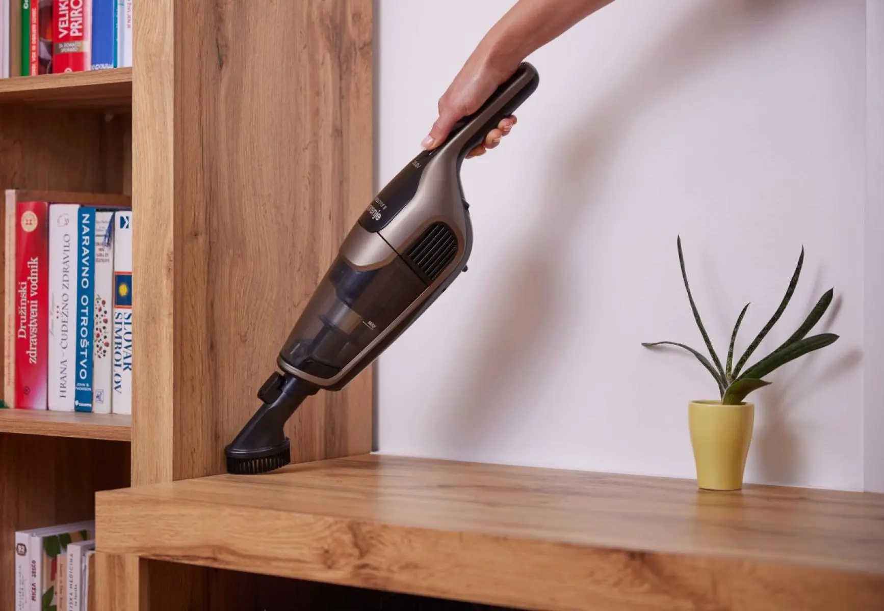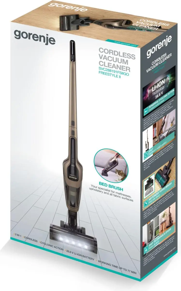 Пилосос Gorenje SVC288191FSIIGO – бездротовий 2-в-1 для легкого прибирання. До 77 хв роботи від акумулятора 28,8 В, швидке заряджання за 4–6 годин. Цифровий дисплей для контролю потужності та заряду. Турбощітка з електроприводом і LED-підсвіткою ефективно очищує підлогу та килими. Легко перетворюється на ручний пилосос для авто й меблів. Зручне зберігання на станції. Щітка для ліжка, гнучка насадка та щітка для пилу забезпечують ретельне прибирання.