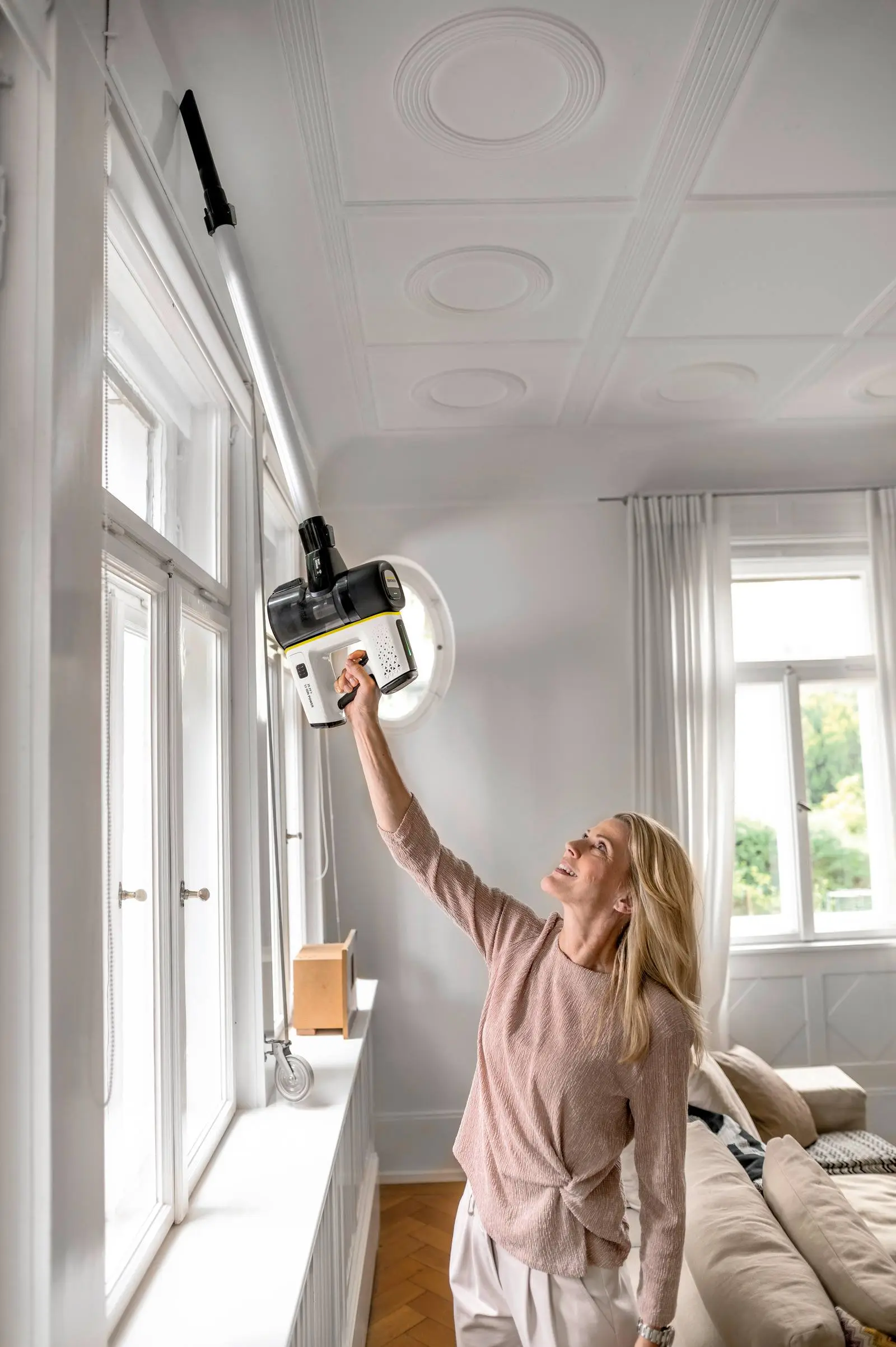 Пилосос VC 7 Cordless yourMax вражає досконалими технологіями, широким оснащенням і зручністю в управлінні. Інноваційний датчик запиленості, що адаптує силу всмоктування до конкретної ситуації прибирання, забезпечує ефективне використання заряду акумулятора і тривалу (до 60 хв) безперервну роботу. Потужний (350 Вт) безщітковий двигун постійного струму, що живиться від акумулятора напругою 25,2 В, гарантує ефективне прибирання, причому функція Boost дає змогу одним натисканням кнопки збільшувати силу всмоктування. Іншими перевагами є гранична простота спустошення контейнера для збору сміття, ергономічна конструкція апарату, придатна для прибирання у важкодоступних місцях, і активна насадка для підлоги зі світлодіодним підсвічуванням, що забезпечує кращу видимість пилу. Очищення фільтра значно полегшується наявністю спеціального інструменту і другого змінного фільтра.