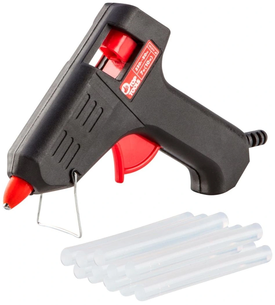 Пістолет клейовий електричний Top Tools (арт.42E581) для стрижнів діаметром 8 мм, потужність 10 Вт. Має наконечник для прецизійного нанесення клею. Може використовуватися для приклеювання килимового покриття або лінолеуму, в меблевому виробництві, для виготовлення біжутерії тощо. Витрати клею становить 6-8 г/хв. Відповідність європейським стандартам безпеки забезпечується сертифікатом CE.
