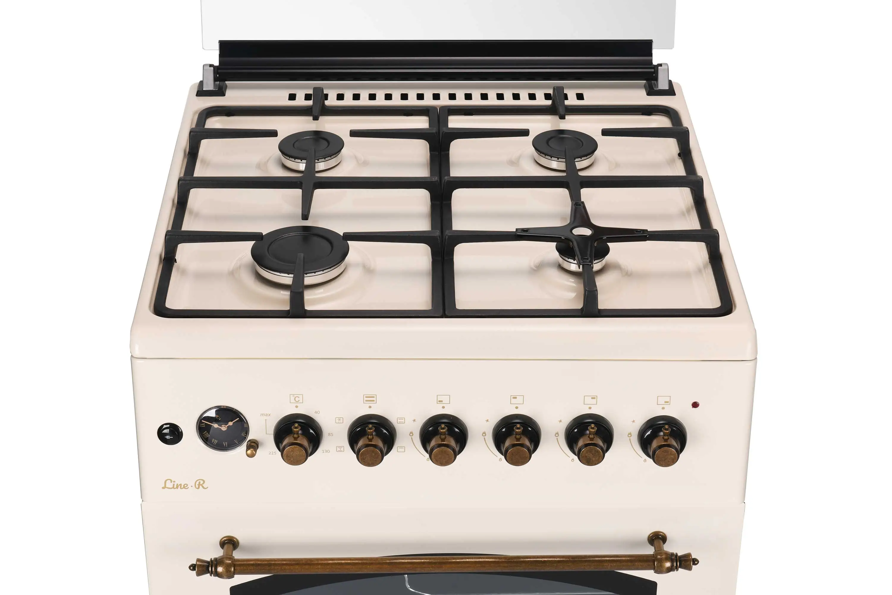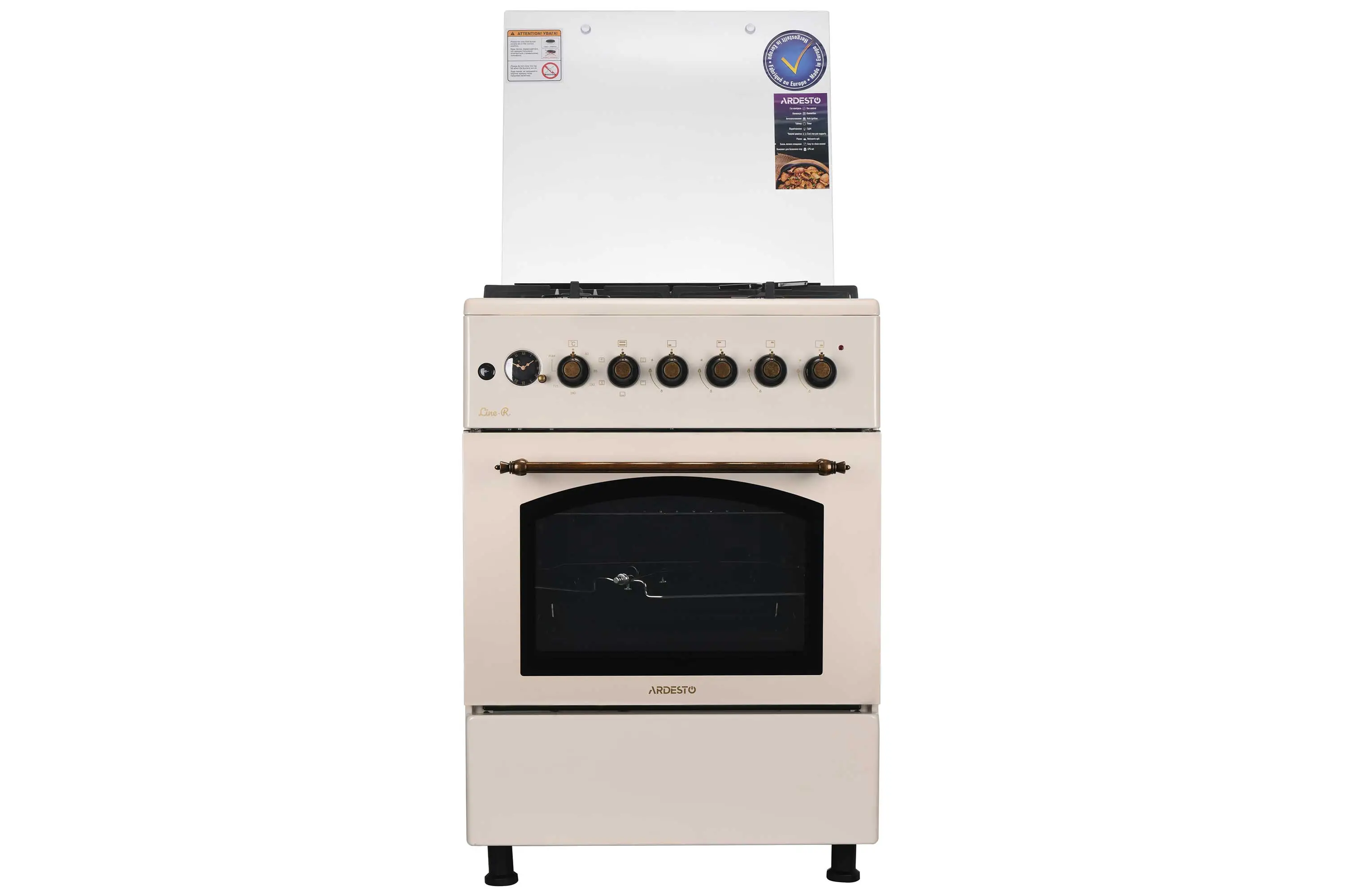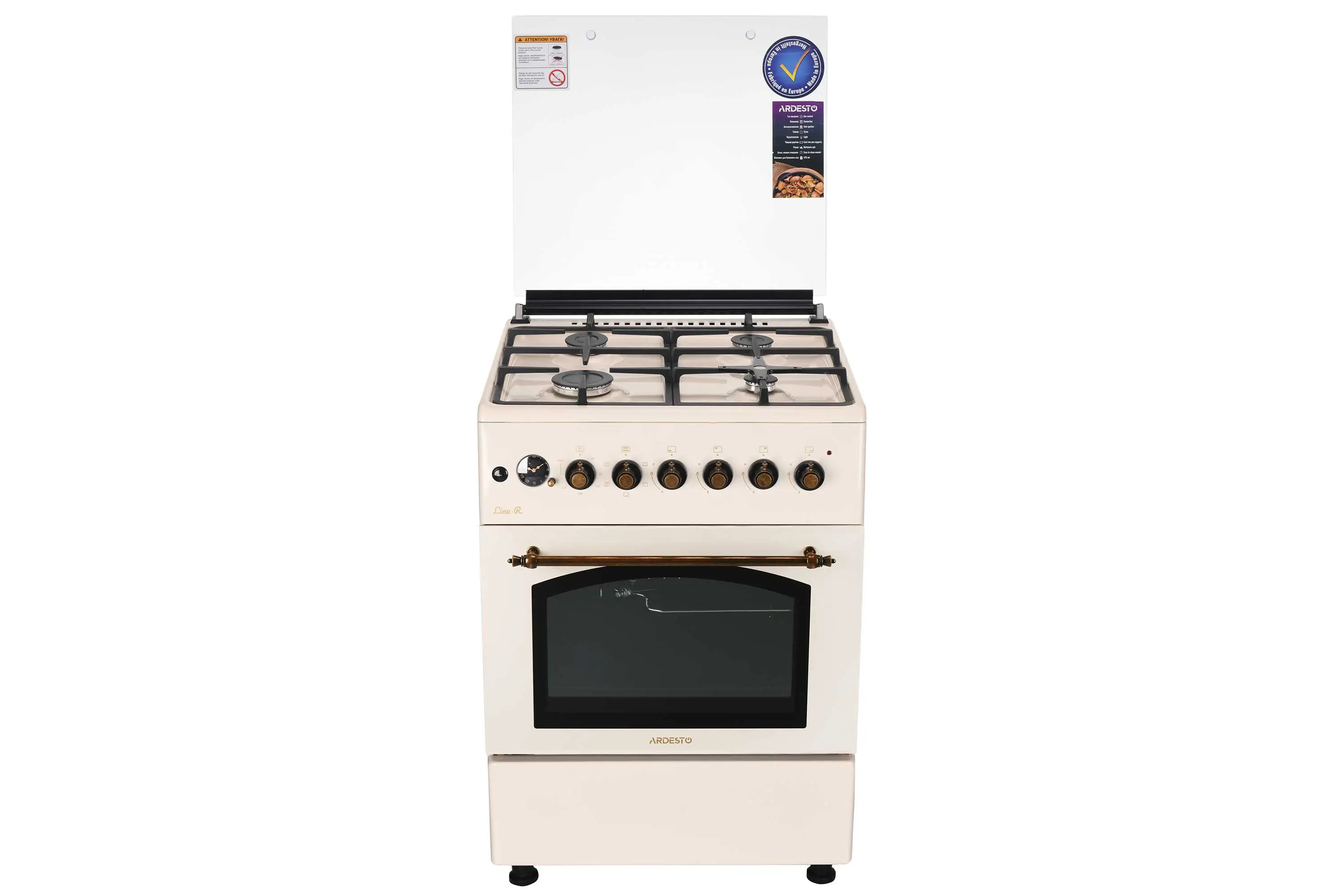 Комбінована плита ARDESTO Line-R FSCF-C607CR кремового кольору в ретродизайні. Має чотири газові конфорки (пальники), вкриті чавунними решітками. Запалювання автоматичне, в ручці. Додатково в комплекті змінні форсунки для скрапленого газу (LPG).
