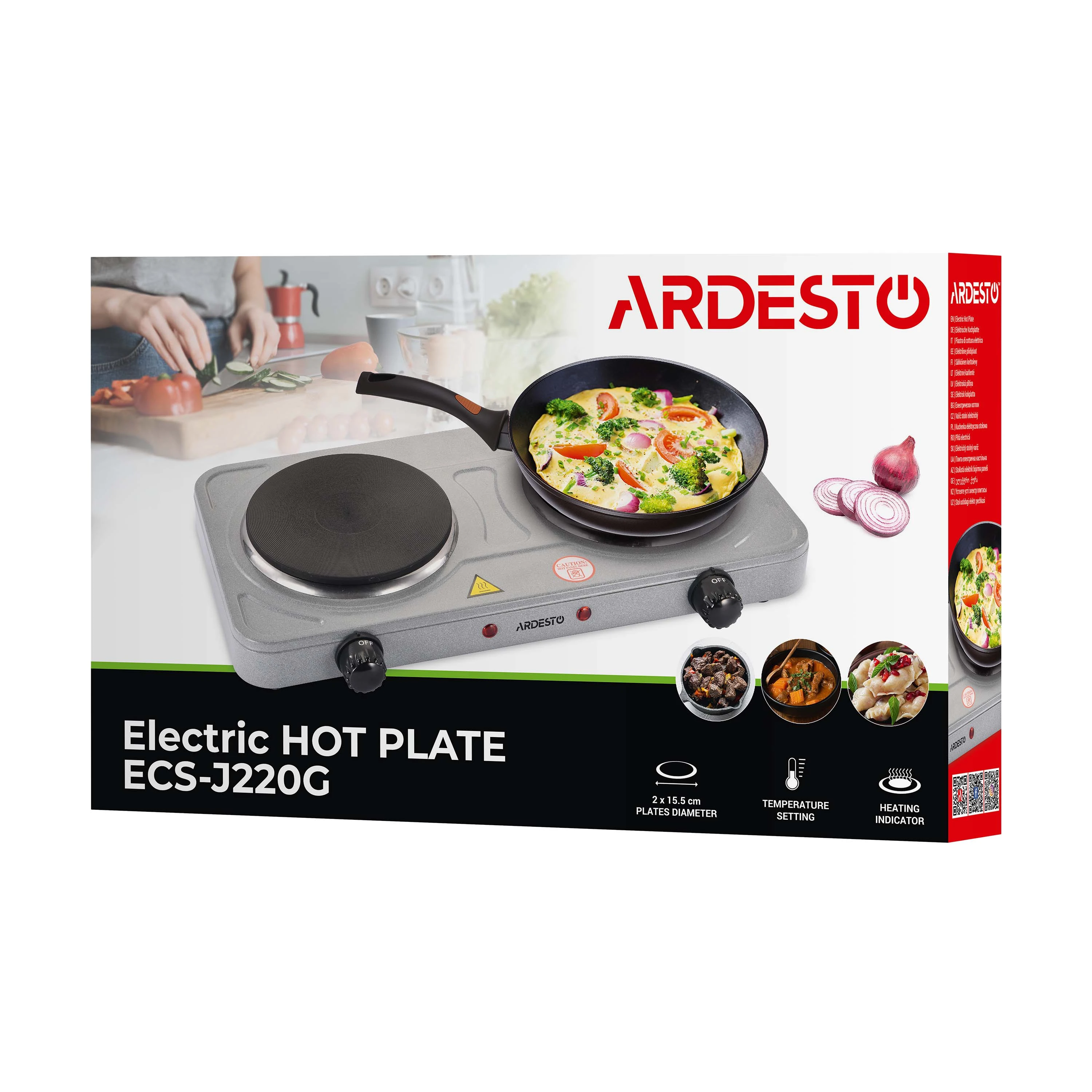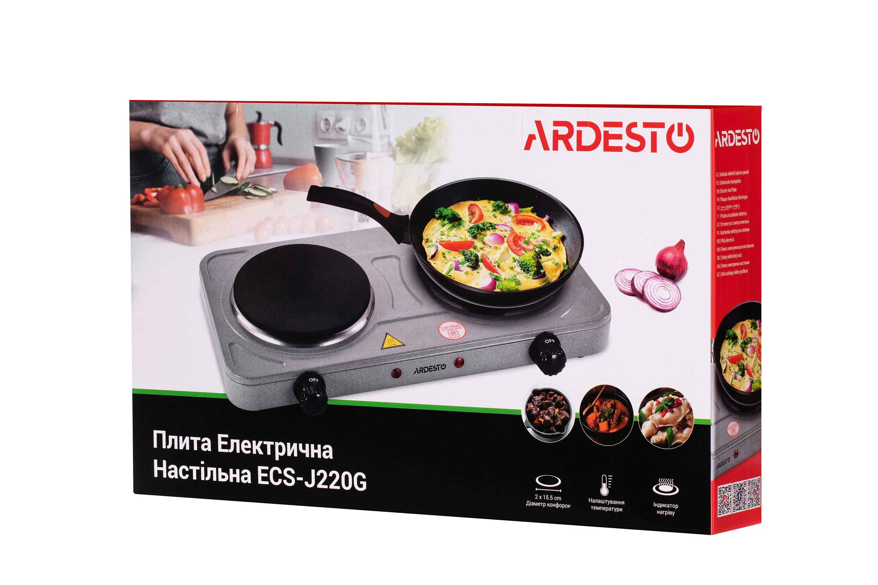 Електрична плита ECS-J220G темно-сірого кольору з двома конфорками діаметром 15,5 см й індикатором нагріву. Потужність кожної конфорки – 1 000 Вт. Чудово підійде для приготування різноманітних страв вдома, на дачі, в гуртожитку, в умовах кемпінгу тощо. Є захист від перепадів напруги в електромережі й регулятор температури має п’ять положень нагріву. Загальна потужність становить 2 000 Вт, напруга – 220 – 240 В. Корпус виготовлено із емальованої сталі. Легка в налаштуванні, користуванні й догляді.