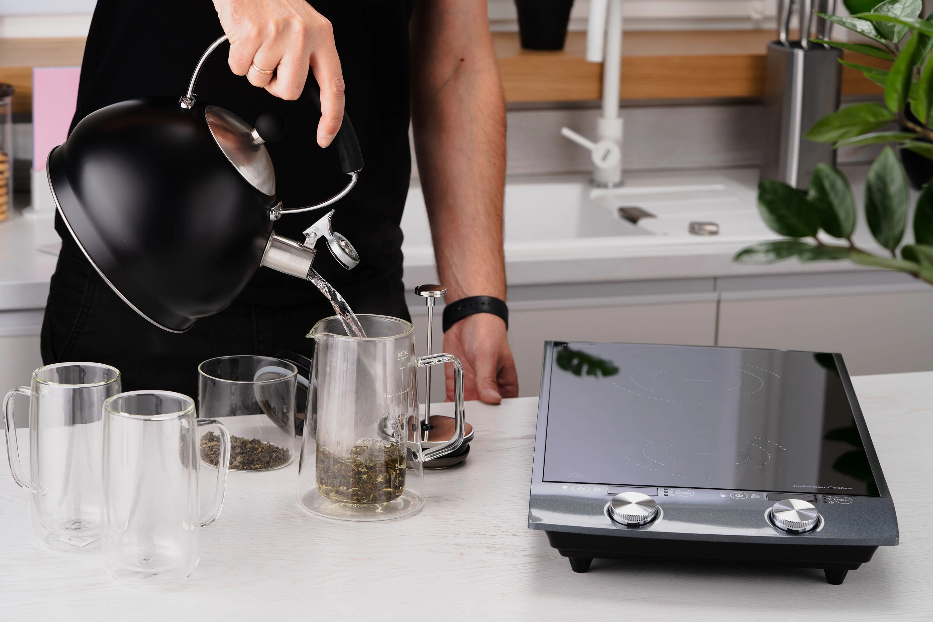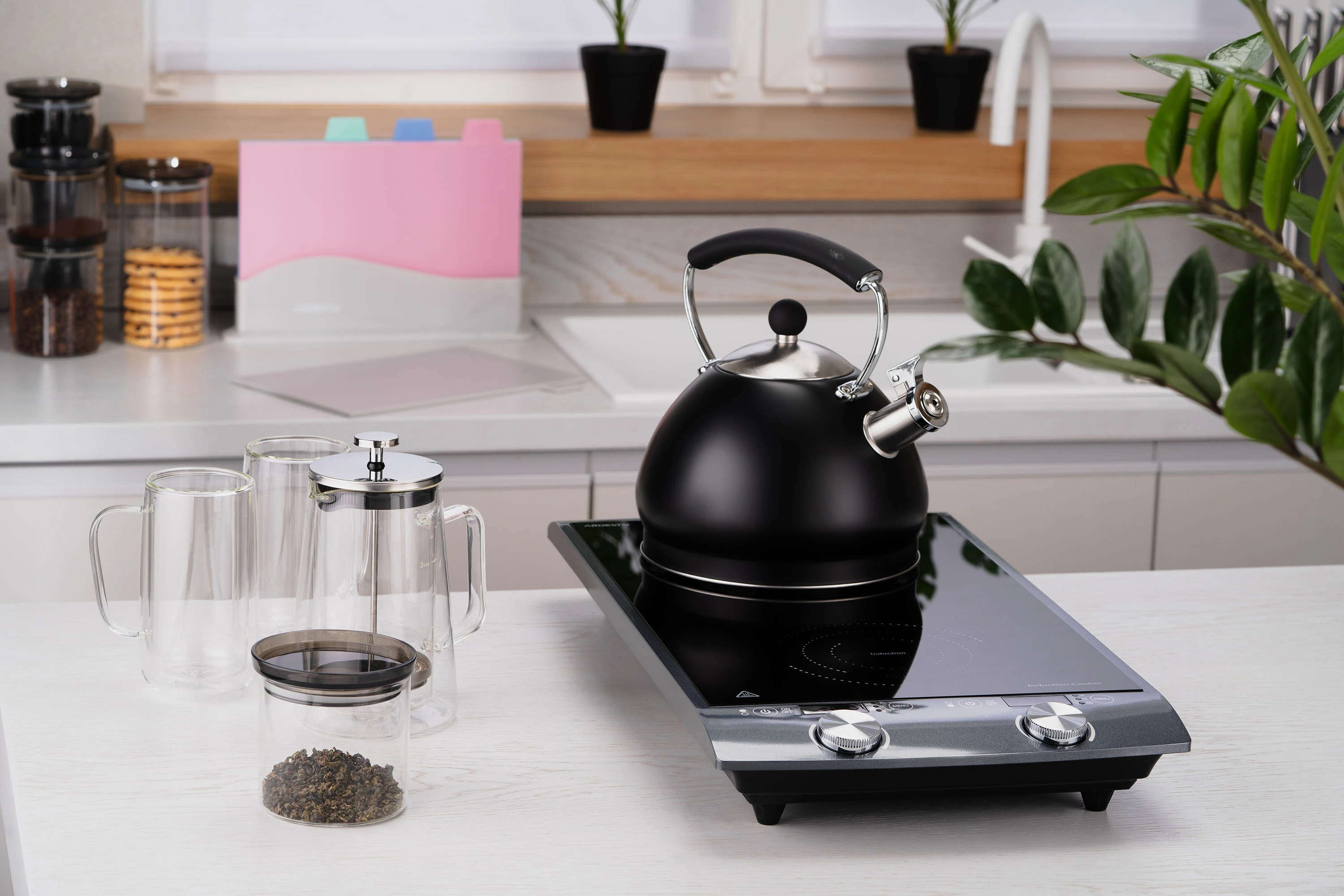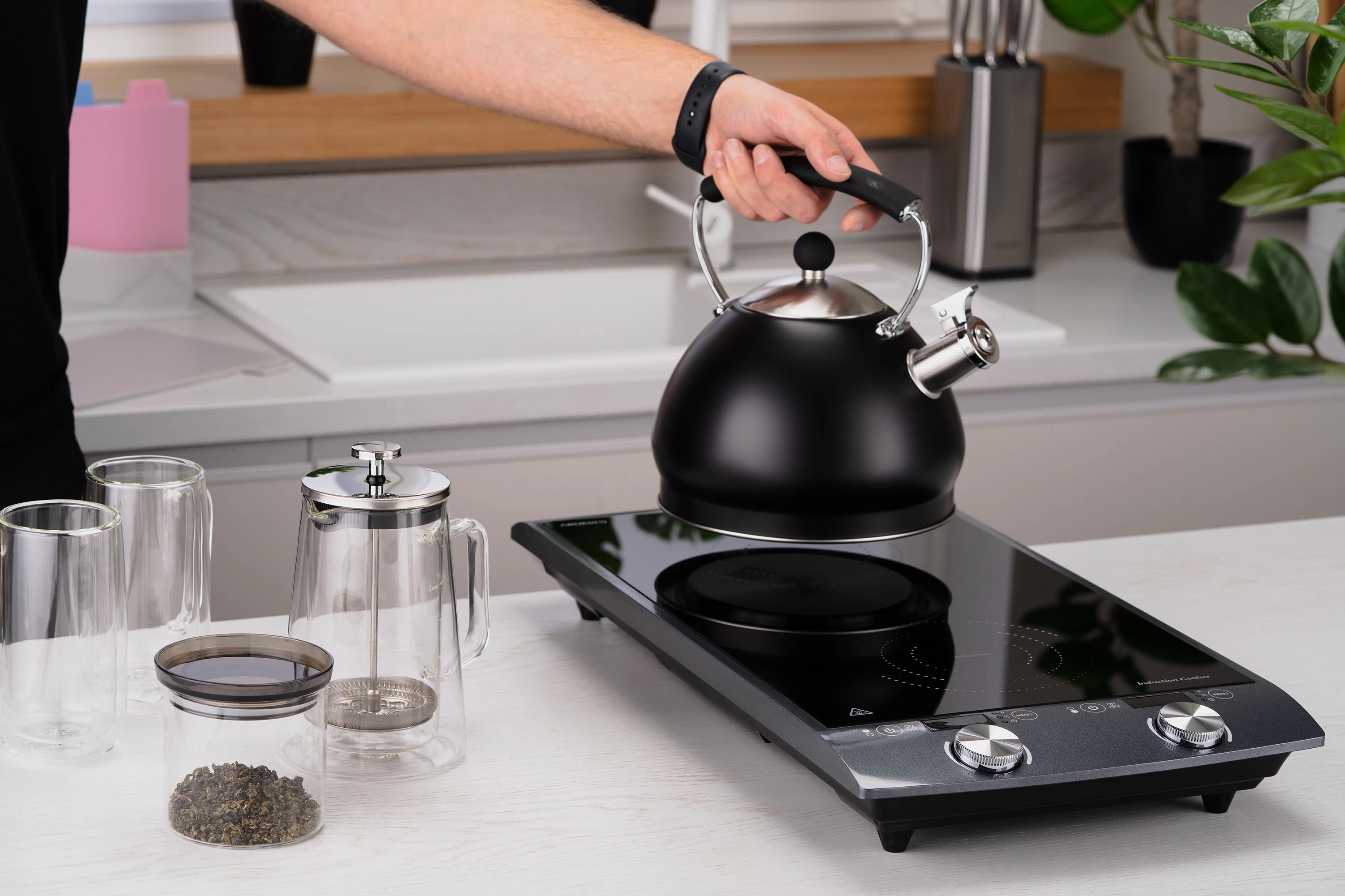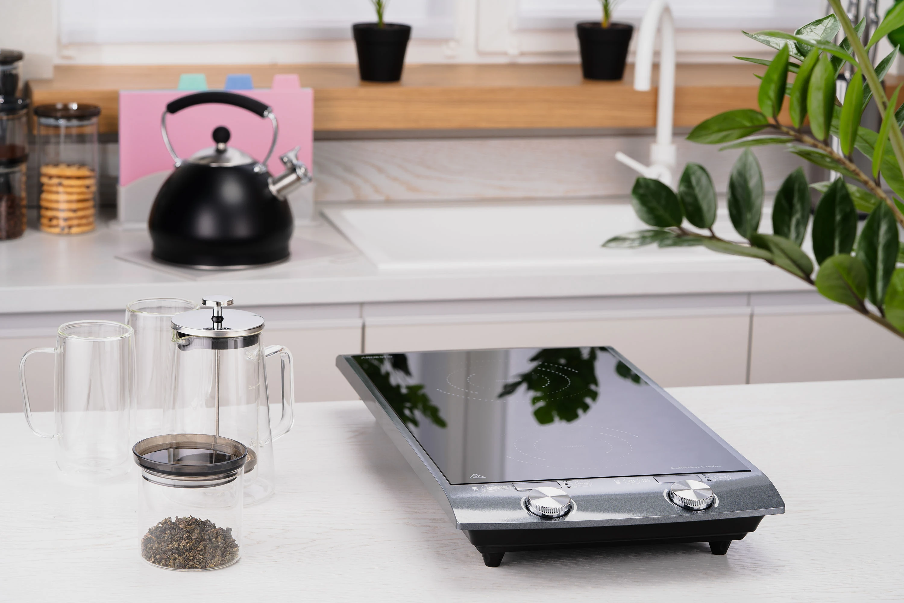 Індукційна електрична варильна поверхня на дві конфорки з загальною потужністю 2900 Вт, комбінованим управлінням, регулюванням температури та потужності, а також таймером приготування та захистом від перегріву і перепадів напруги.