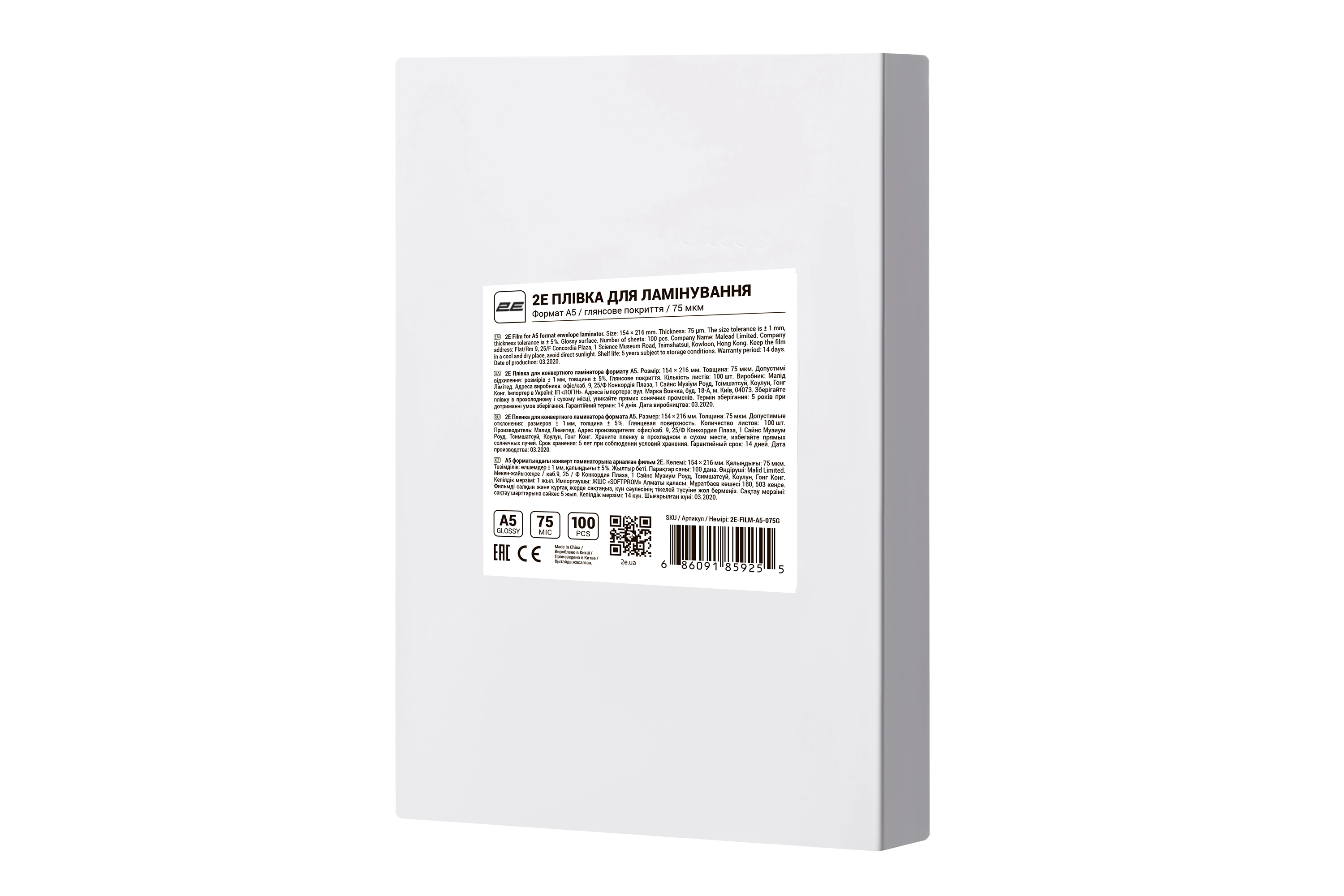 Плівка для горячого ламінування формату A5 з глянсовою поверхнею і товщиною 75 мкм.