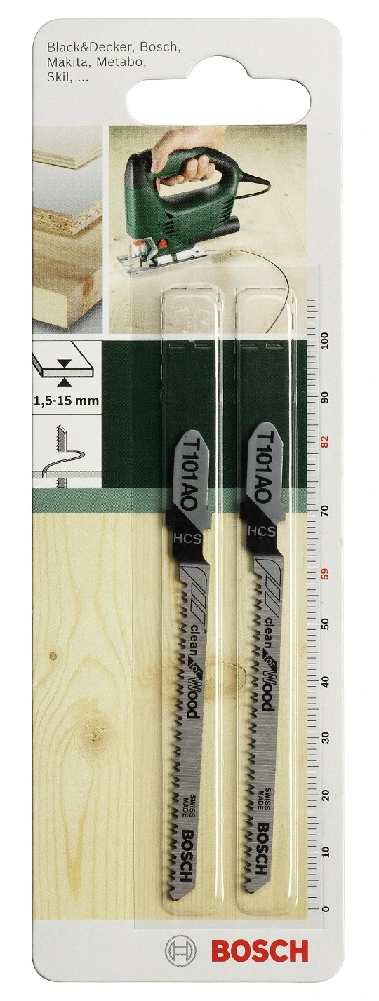 Пилка Bosch T 101 AO довжиною 82 мм, з поверхнею з зубцями 59 мм, з кроком зубців 1,4 мм, 19 TPI. Із високовуглецевої HSC сталі. Виконує чисте, криволінійне різання м'якої деревини та ДСП товщиною 1,5-15 мм. В упаковці 2 шт.