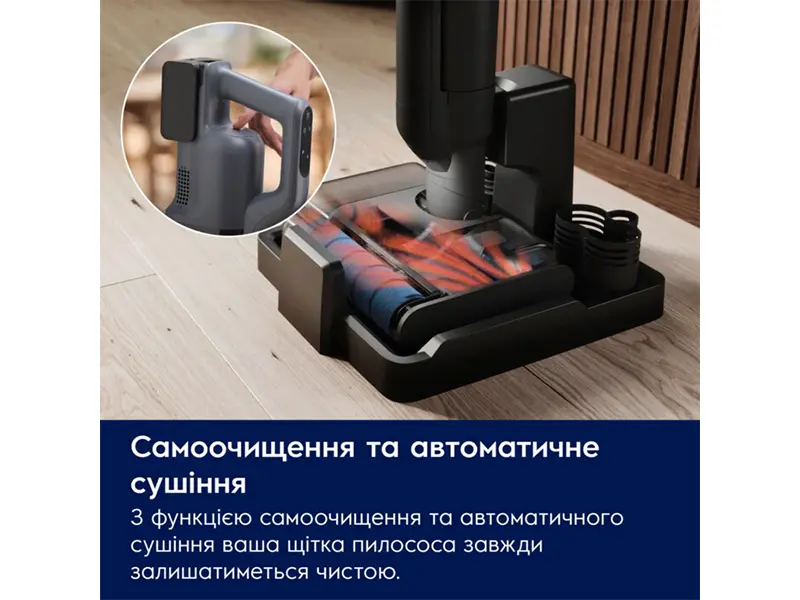 Просто активуйте систему самоочищення, щоб вимити й висушити DualRolls після використання. Ролики промиваються на високій швидкості 700 об/хв та висушуються при 70°C для усунення будь-яких запахів або залишків сміття. Ваш пилосос завжди чистий, свіжий і готовий до використання.