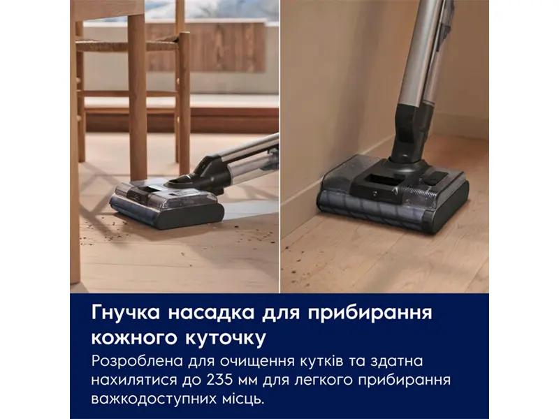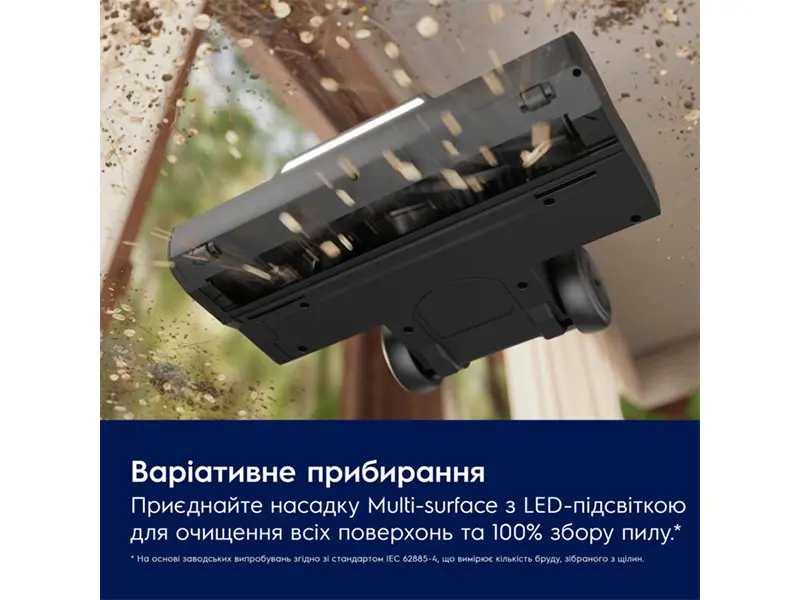 Для прибирання без зупинок просто приєднайте багатофункціональну насадку до ручного блоку. Ідеально підходить для всіх типів підлоги, зокрема килимів, і видаляє 100%* пилу в щілинах. Потужний літій-іонний акумулятор забезпечує до 70 хвилин** безперервної роботи.
