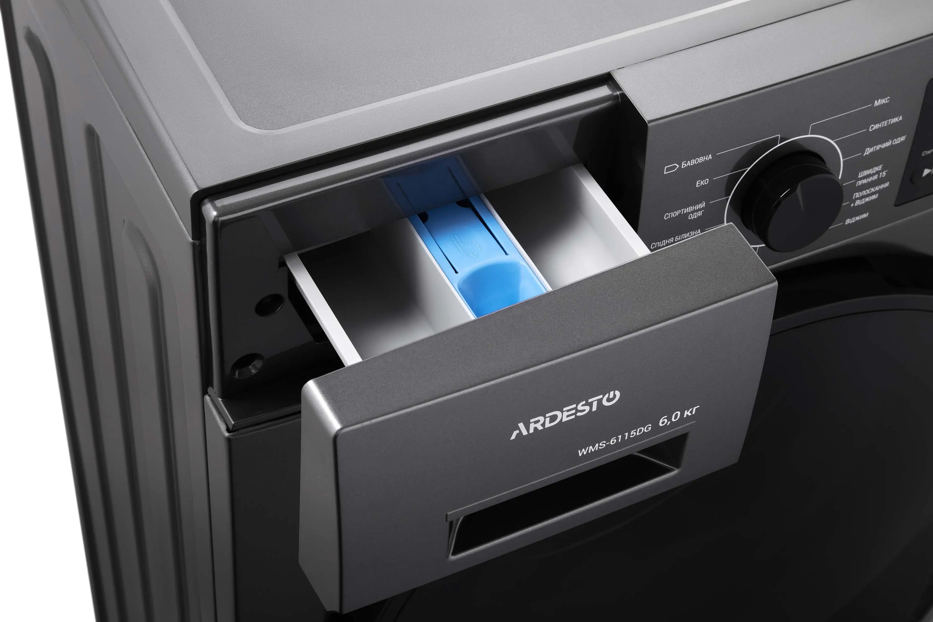ARDESTO WMS-6115DG – автоматична пральна машина з фронтальним завантаженням. Сучасний оригінальний дизайн Black Mars підкреслюють темно-сірий колір, вбудований дисплей і великий чорний люк. Здатна ретельно випрати й охайно віджати до 6 кг білизни, вона неодмінно стане надійною помічницею в оселі. Максимальну швидкість обертання барабану 1 000 об./хв забезпечує двигун потужністю1 750 Вт. Високий клас енергоефективності – А++, компактний розмір (глибина лише 44 см) і приваблива ціна роблять WMS-6115DG дійсно вигідним придбанням.