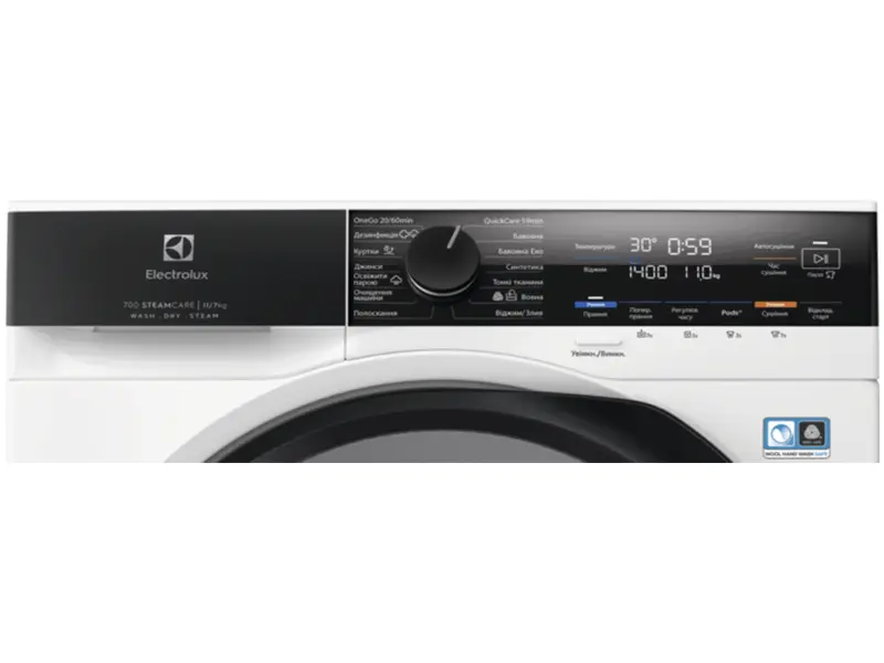 * Програми: Quickcare 59Min, Cottons, Cotton Eco, Синтетика, Delicates, Шерсть, Віджимання/злив, Ополіскування, Machine Clean, Освіження з обробкою парою, Джинсові речі, Верхній одяг, Hygiene, Onego 20/60Min.