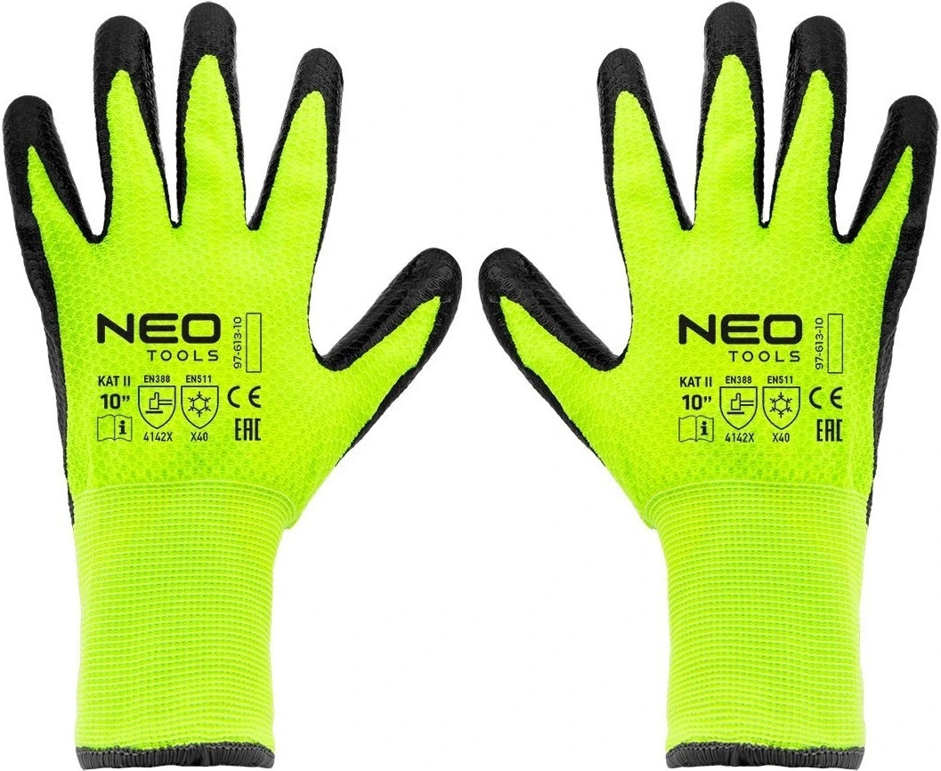 Утеплені робочі рукавички NEO розміру 10, нейлон з латексним покриттям, 4142X 97-613-10, виготовлені з нейлону з латексним покриттям. Вони мають високу стійкість до стирання (від 0 до 4) 4, стійкість до порізів гострими предметами (від 0 до 5) 1, стійкість до розриву (від 0 до 4) 4 та стійкість до проколу (від 0 до 4) 2. Вони також відрізняються стійкістю до порізів відповідно до EN ISO 13997 X. Рукавички добре сидять на руці. Вони можуть використовуватися для всіх видів транспортування, переміщення, зберігання, складальних робіт, виробництва дрібних деталей, DIY, автомобілебудування та садівництва. Вони захищають руки від холоду, бруду, подряпин, відбитків та шкідливих умов праці. При правильній конструкції - запобігає вислизанню інструментів з рук. Маркування CE на відповідність стандартам EN 388, 22242X та EN511, що забезпечує захист від холоду, є гарантією безпеки, що підтверджує, що продукт марки NEO відповідає всім вимогам СЕ.
