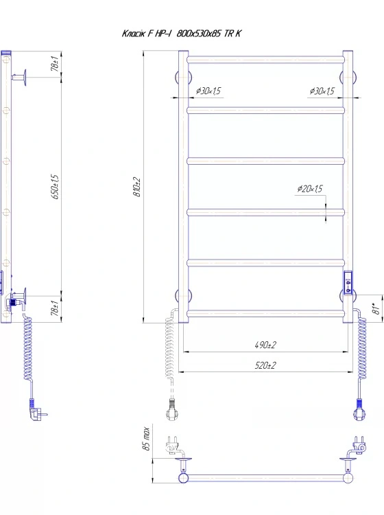 Електросушарка для рушників побутова Класік F НР-I 800х530/75 TR K. Обладнана таймер-регулятором та конектором для підключення в розетку з будь-якого боку. Сумісна з комплектом прихованого підключення. Має 6 ребер та стояки з круглої труби.