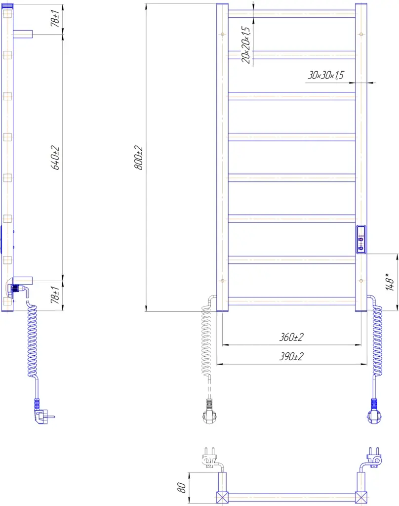 Електросушарка для рушників побутова Токіо-I 800х500/80 TR К. Обладнана таймер-регулятором та конектором для підключення в розетку з будь-якого боку. Сумісна з комплектом прихованого підключення. Має 8 ребер та стояки з квадратного профілю.