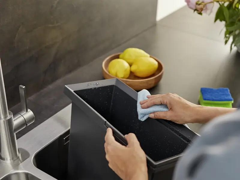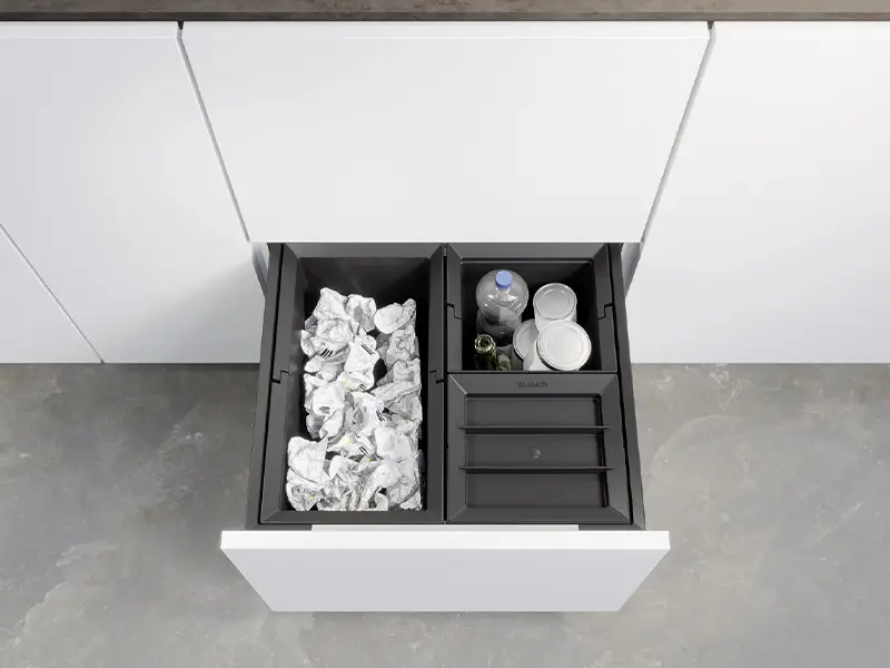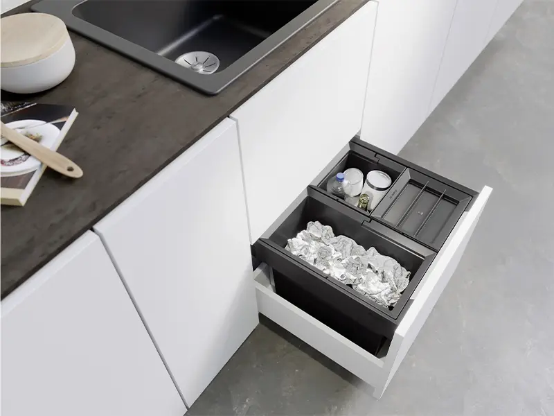 Різноманітні варіанти вибору та зберігання відходів за рахунок гнучких комбінацій відер для сміття з вимогами до розмірів у тумбі під мийкою.