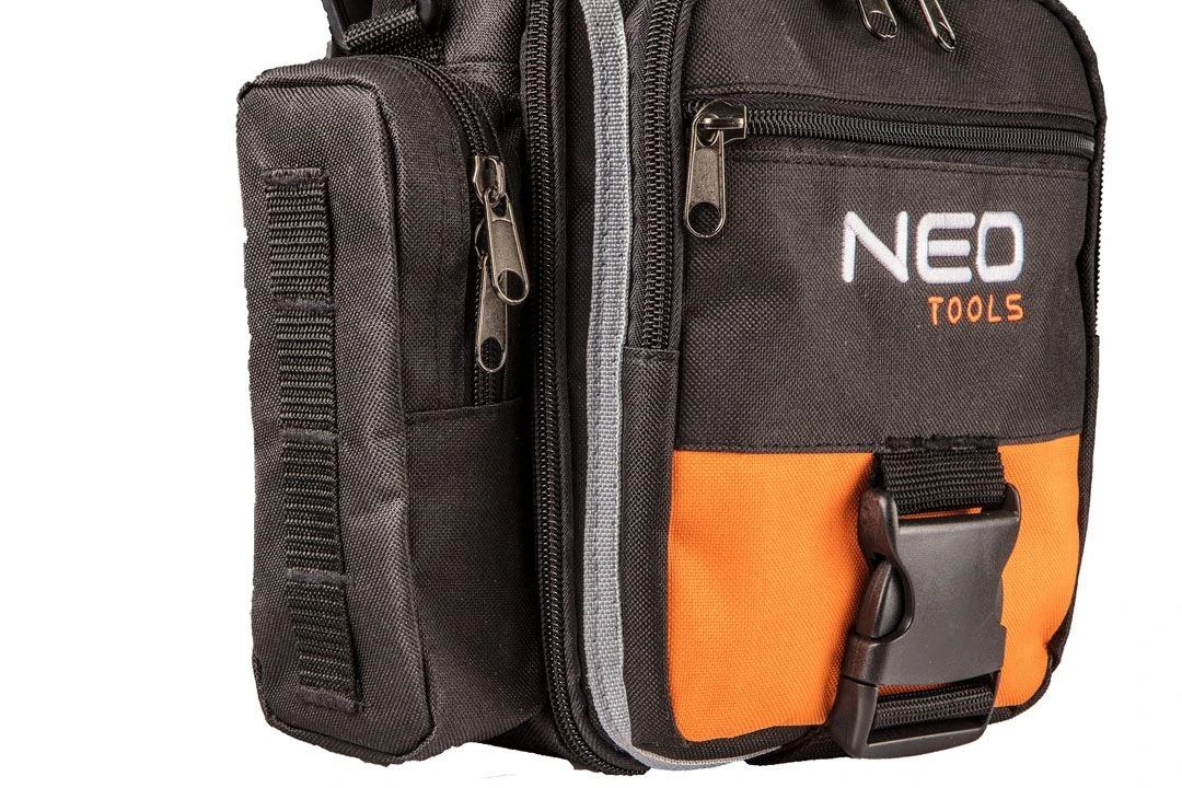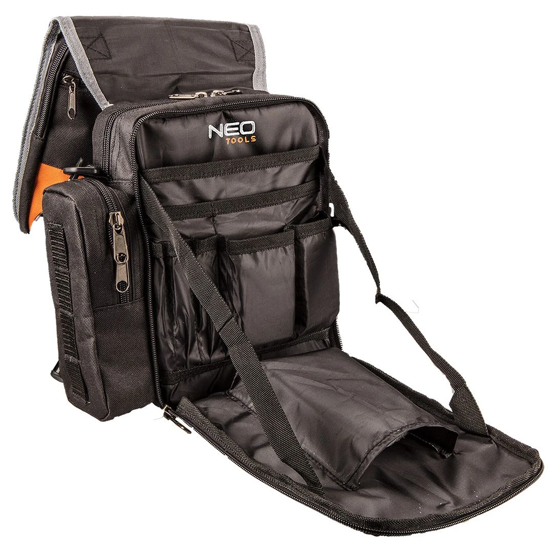 Сумка для інструменту NEO (арт. 84-315) із міцного поліестеру, з 4 зовнішніми кишенями і 4 внутрішніми кишенями. Місткий основний відділ мое вмістити велику кількість інструментів. Додаткова перевага сумки - розкладна конструкція, що полегшує роботу. Сумка з регульованим плечовим ременем, ручкою для перенесення і гачками для кріплення на ремінь, що полегшують експлуатацію.