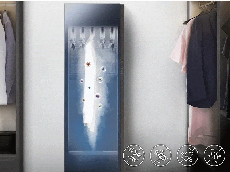 Дезінфікуйте й освіжайте свій одяг. Функція дезінфекції використовує технологію JetSteam для знищення 99,9% бактерій та вірусів і вбиває 100% пилових кліщів*. Технологія Wrinkle Care за допомогою технологій JetSteam і JetAir для розгладжування складок на одязі. Крім того, технологія JetSteam видаляє запахи газів і шкідливих речовин
