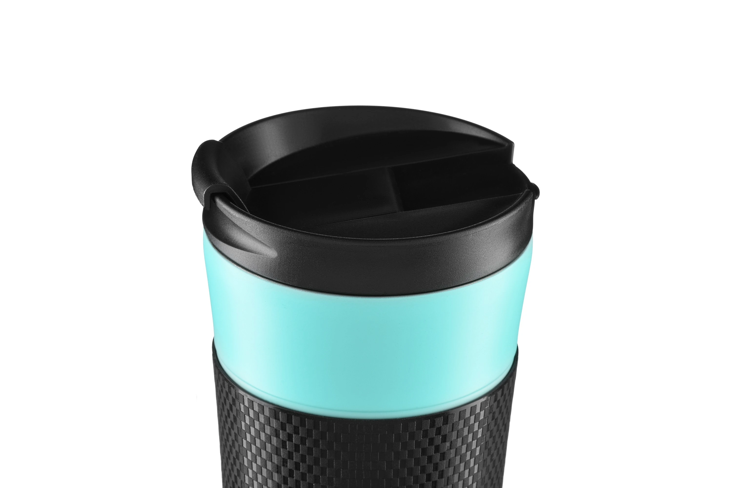 Термочашка на 450 мл з вакуумною технологією зберігання температури – до 8 годин для гарячих напоїв, та 12 годин для холодних. Зовнішня металева частина пофарбована у кольорі тіффані з матовою текстурою. Для зручності передбачено силіконове покриття під долоню. Внутрішня частина виконана з нержавіючої сталі 18/10. Нековзка основа запобігає перевертанню, а пластикова кришка отримала силіконову прокладку та відкидну заглушку.