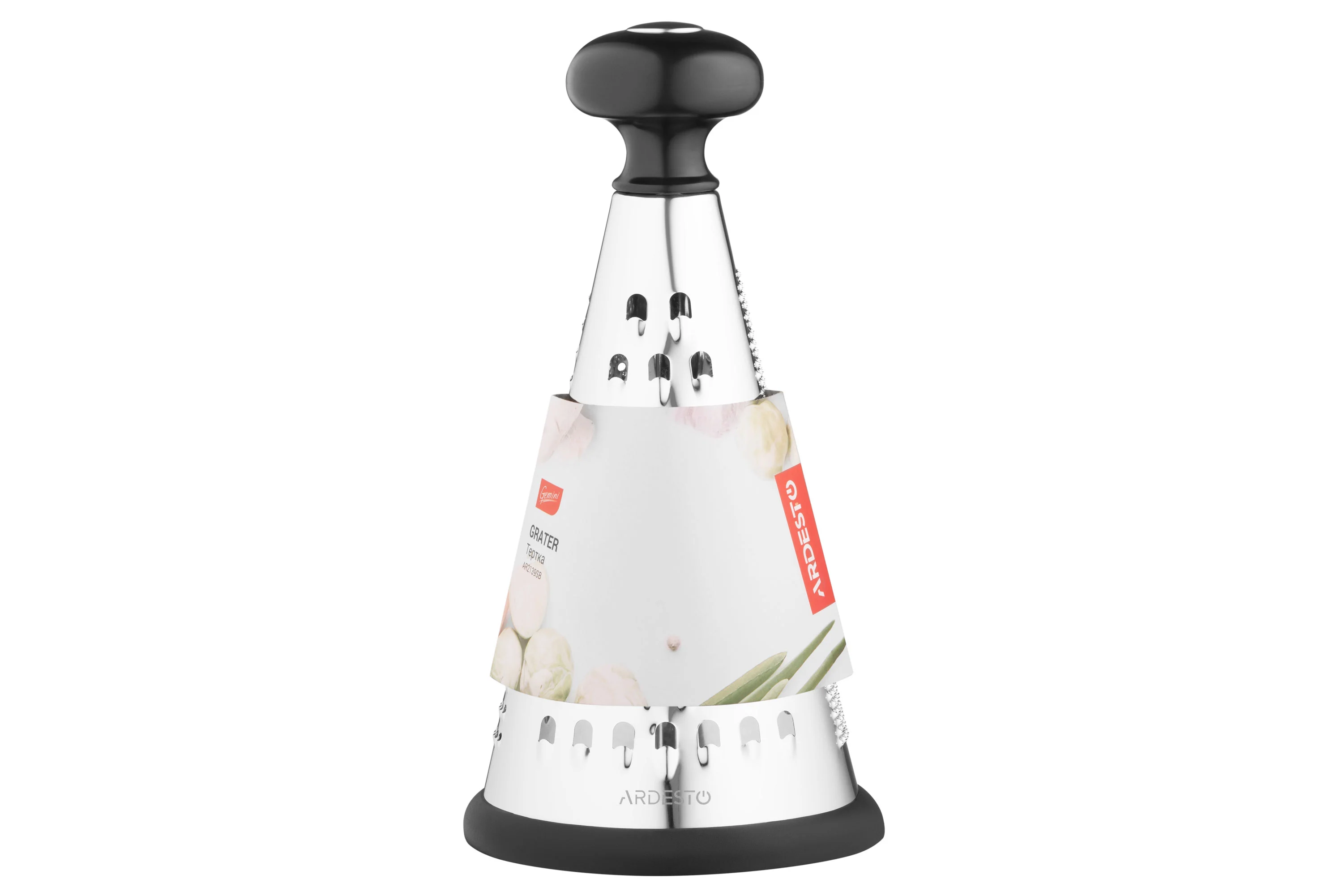 Із терткою ARDESTO Gemini можна швидко подрібнити овочі, фрукти та тверді продукти. Виготовлена у вигляді конуса з нержавіючої сталі – міцного і довговічного матеріалу, стійкого до корозії. Ручка з пластику чорного кольору не вислизатиме з рук. Розмір 23,5 см. Виріб можна мити в посудомийній машині.