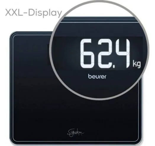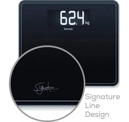 Скляні ваги насиченого чорного кольору Beurer GS 410 Signature Line — мінімалістичний дизайн і функціональність в одному пристрої! Точні дизайнерські ваги не тільки покажуть результати зважування, а й ідеально впишеться в інтер'єр вашого будинку як декоративний елемент. Велика платформа з міцного скла завтовшки 8 мм — комфортне й безпечне використання. Цифри збільшення розміру зі спеціально розробленим РК-шрифтом на сучасному чорному дисплеї з підсвіткою — значення ваги завжди можна легко прочитати навіть за низького освітлення.