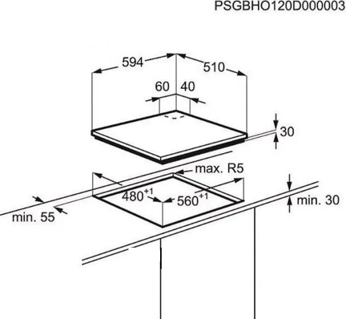 * Передня права конфорка: Діаметр 5,4 см, потужність 1 кВт