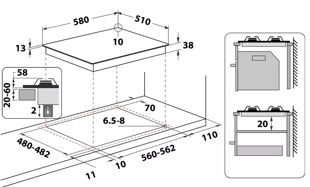 - Розміри для вбудовування 560-562 мм х 480-482