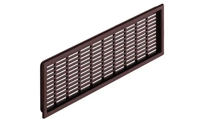 Прямокутна вентиляційна решітка з прорізами і захисною кромкою, виготовлена з пластмаси коричневого кольору. Вона відрізняється такими параметрами: