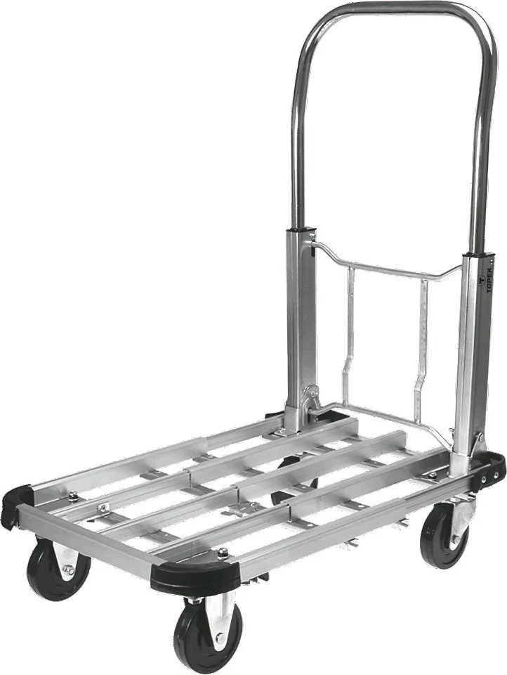 Візок вантажний складаний, платформний, TOPEX 79R300 це легкий і зручний візок з міцних алюмінієвих профілів, з регулюванням висоти ручки в діапазоні 50-70 см. Чотириколісний візок з платформою 70x42 см та вантажопідйомністю до 150 кг дозволяє ефективно перевозити важкі вантажі різних габаритів. Візок оснащений міцними колесами, а також упорними пластмасовими бортиками. Візок складний, тому зручний при транспортуванні. Вага візка 7.7 кг. У складеному стані візок займає мало місця, що зручно для зберігання та переміщення.