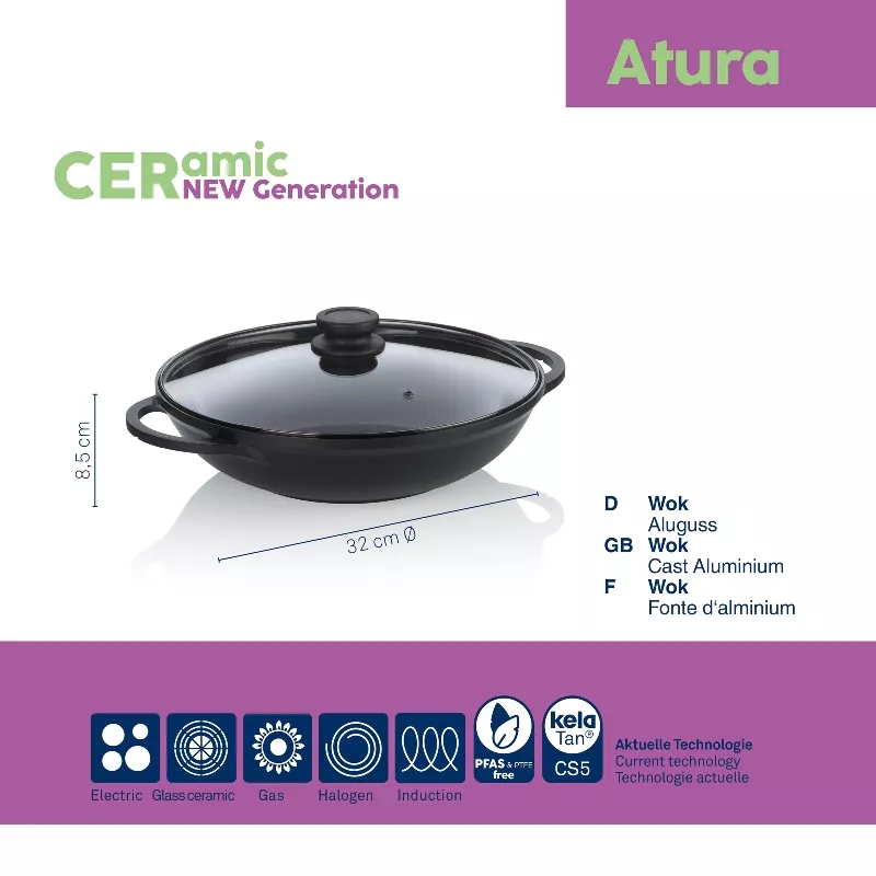Керамічне покриття вок-сковороди KELA Atura нового покоління без ПФАС (PFAS), термостійкість виробу до 250°C.