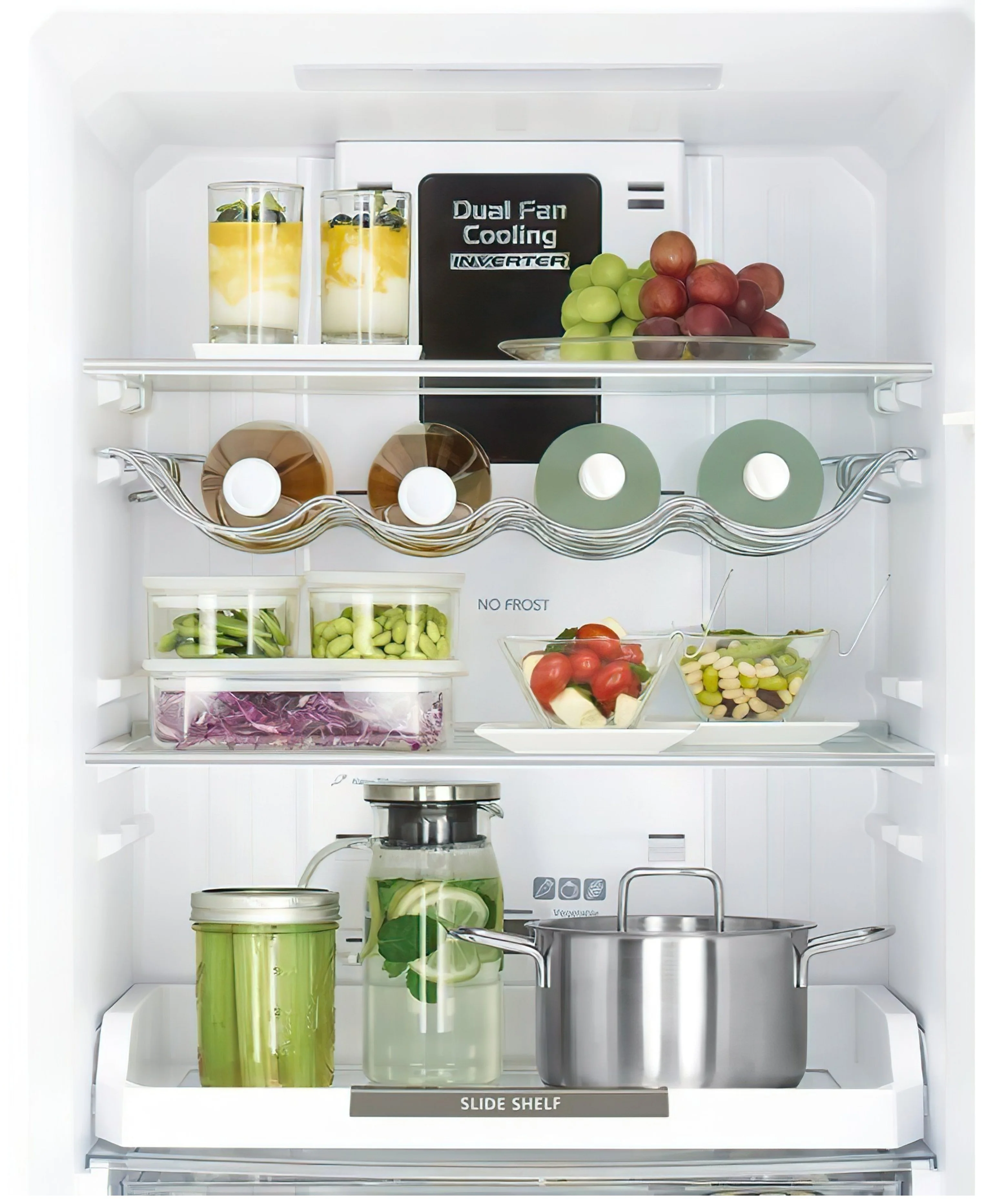 Hitachi R-BG410PUC6XGPW – холодильник японського виробника з двома камерами. Компактні габарити поряд із місткими полицями дозволяють розмістити агрегат у невеликому просторі, при цьому отримати достатньо місця для зберігання тижневого запасу продуктів. Морозилка з трьома ящиками різної величини із прозорого пластику. Завдяки спеціальному механізму вони висуваються до кінця, для зручного розміщення заготовок. Загальна місткість – 115 літрів. Холодильний відсік на 215 л оснащений трьома полицями з міцного скла, за рахунок додаткових пазів у бічних стінках їх можна регулювати по висоті. Два висувні контейнери для овочів зберігають їх свіжими довгий час, створюють спеціальний мікроклімат з підтримкою вологи.