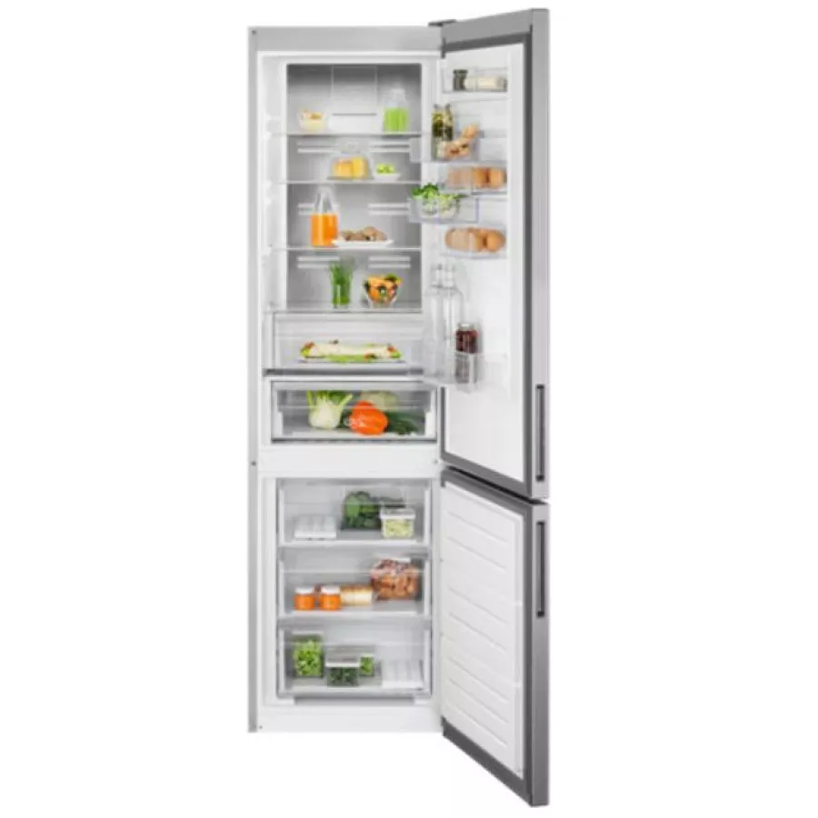 Холодильник із морозильною камерою Electrolux RNT7ME34X2 виготовляється у сучасному лаконічному дизайні у стильному кольорі нержавіючої сталі. Вся його конструкція – від вертикальних інтегрованих ручок до полиць, що переставляються по висоті – створює максимальний комфорт для користувача. У дводверній одноконтурній моделі класу енергоспоживання А++ встановлений надійний і тихий компресор інверторний – його шум не перевищує 42 дБ. Її холодильна секція об'ємом 266 літрів оснащена системами Cooling 360 і Action Cool, що охолоджують. Через продумано розташовані отвори вони розподіляють холодне повітря по всьому внутрішньому простору, спрямовуючи його на продукти з усіх боків. Задня стінка з нержавіючої сталі забезпечує швидке охолодження, а в камері свіжості місткістю 22 літри підтримується близька до нуля температура. Нижній морозильний відсік ємністю 94 літри укомплектований трьома висувними контейнерами та забезпечений функцією швидкого заморожування Action Freeze. Холодильник Electrolux RNT7ME34X2 керується електронними кнопками із зовнішнім дисплеєм. Його холодильна камера розморожується автоматичним (краплинним) способом, а морозильна – системою Frost Free.