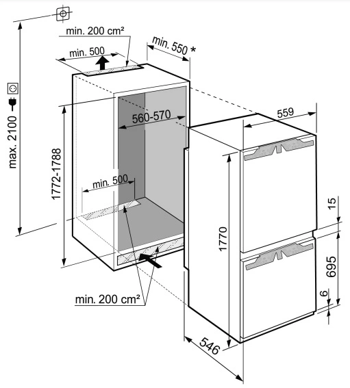 Холодильник Liebherr вбудований з нижн. мороз., 177x55.9х54.6, холод.відд.-182л, мороз.відд.-80л, 2д