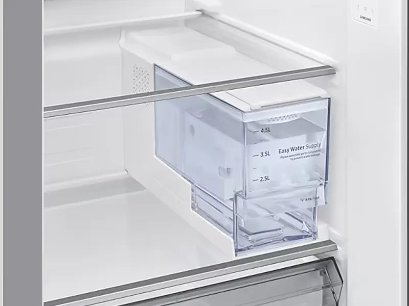 Розміщуйте холодильник у будь-якому місці без необхідності складного підключення до водопроводу чи використання непривабливих труб. Він оснащений містким 4,5-літровим резервуаром для води без BPA, що забезпечує роботу диспенсера без підключення до водопроводу.