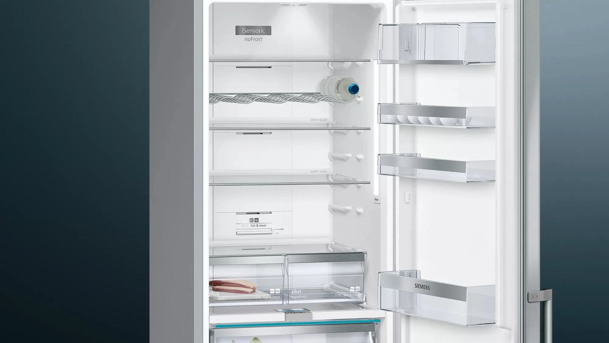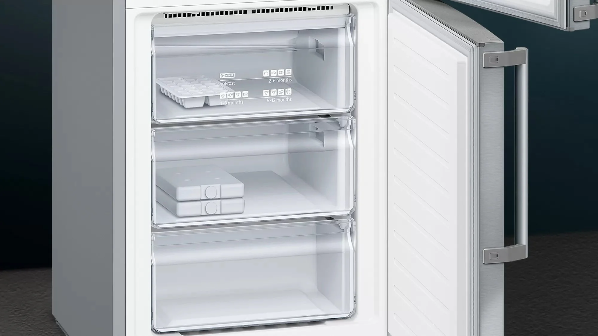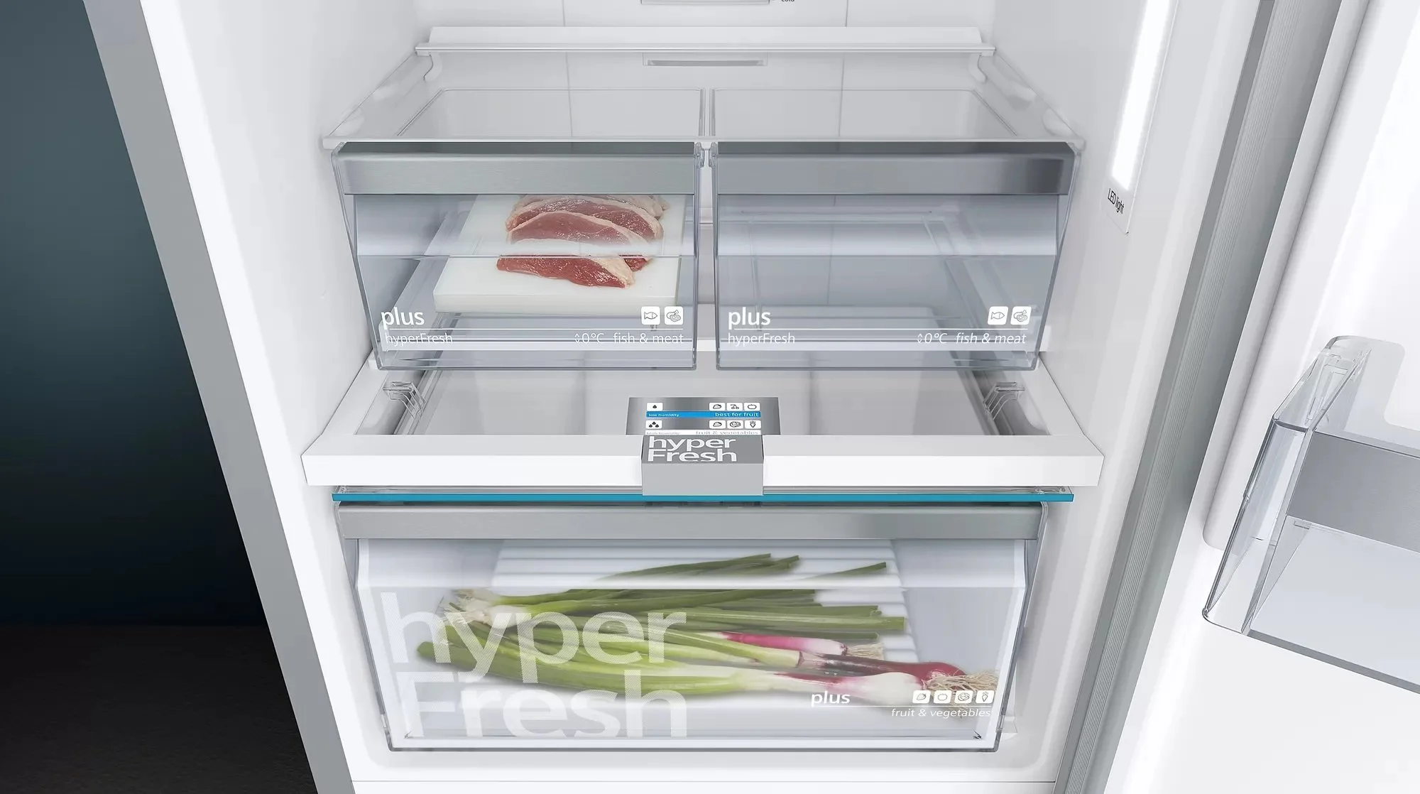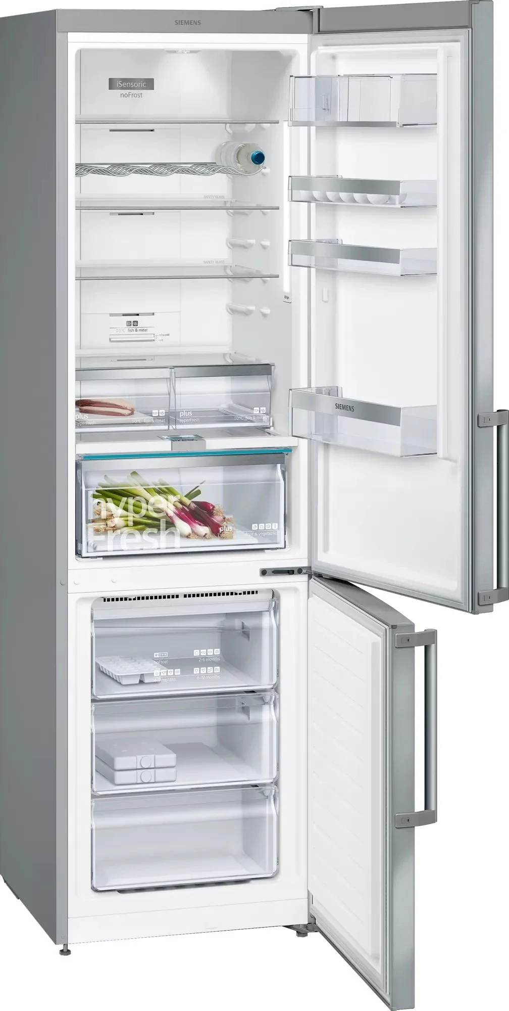 Окремий холодильник з нижньою морозильною камерою нерж. ст. легкої очистки. Холодильник Siemens iQ500 висотою 203 сантиметри. Забудьте про розморожування та намерзання льоду із системою NoFrost. Зона свіжості hyperFresh для більш тривалого зберігання овочів та фруктів. Три відділення у морозильній камері. Зберігає фрукти та овочі свіжими до 2-х разів довше. Слайдер дозволяє налаштувати рівень вологості у відділенні hyperFresh plus залежно від продуктів, що знаходяться у ньому. Смак, вітаміни та поживні речовини краще зберігаються при оптимальній вологості.