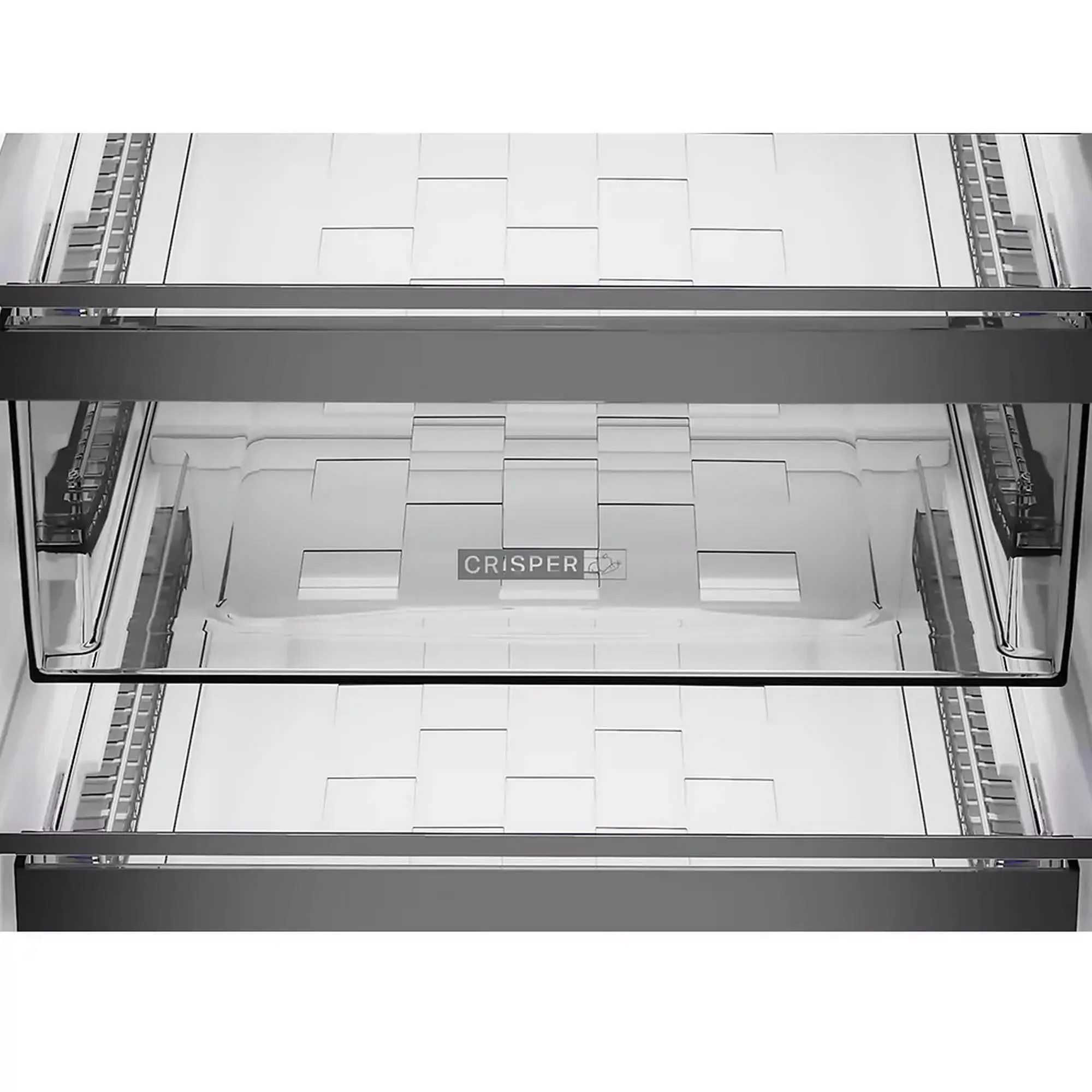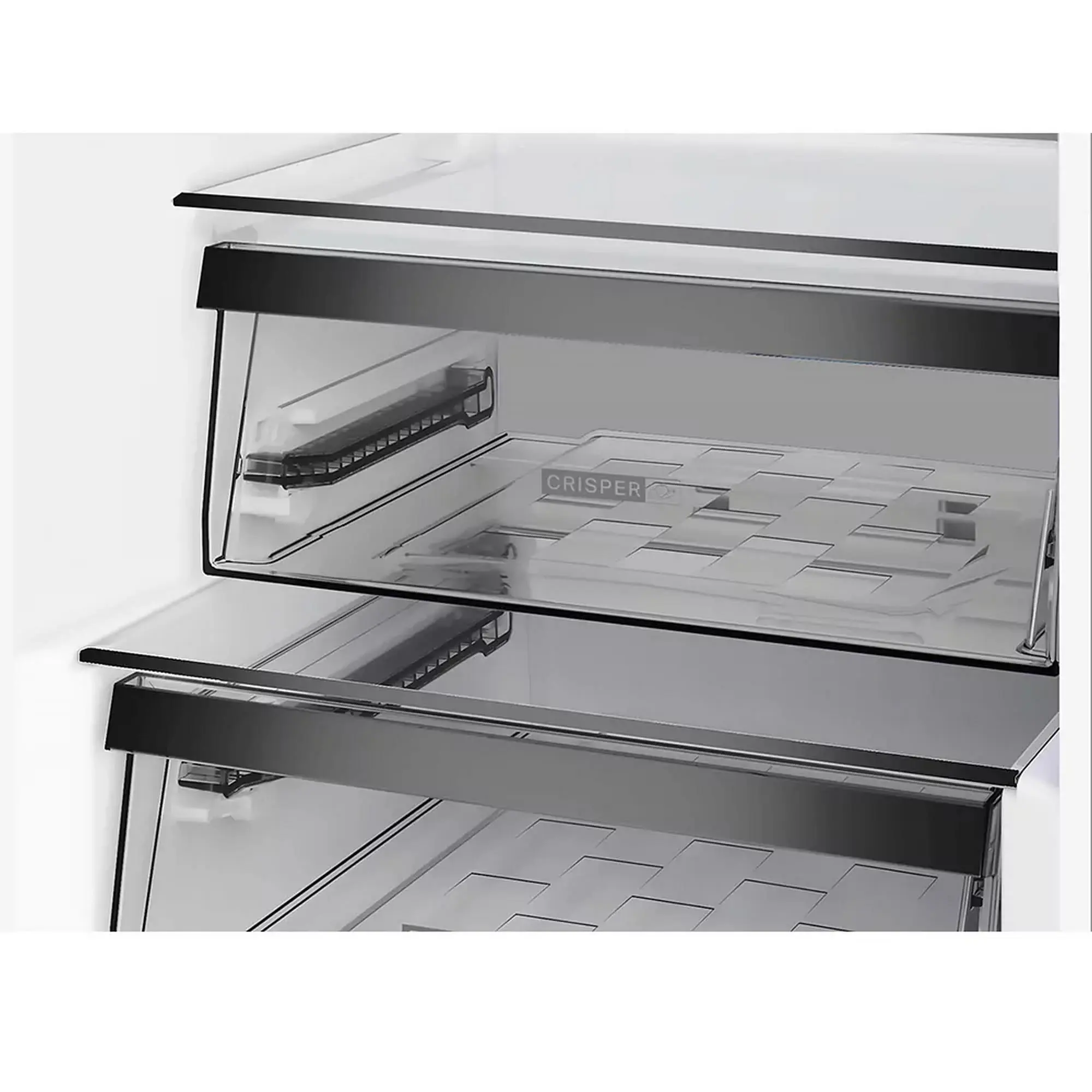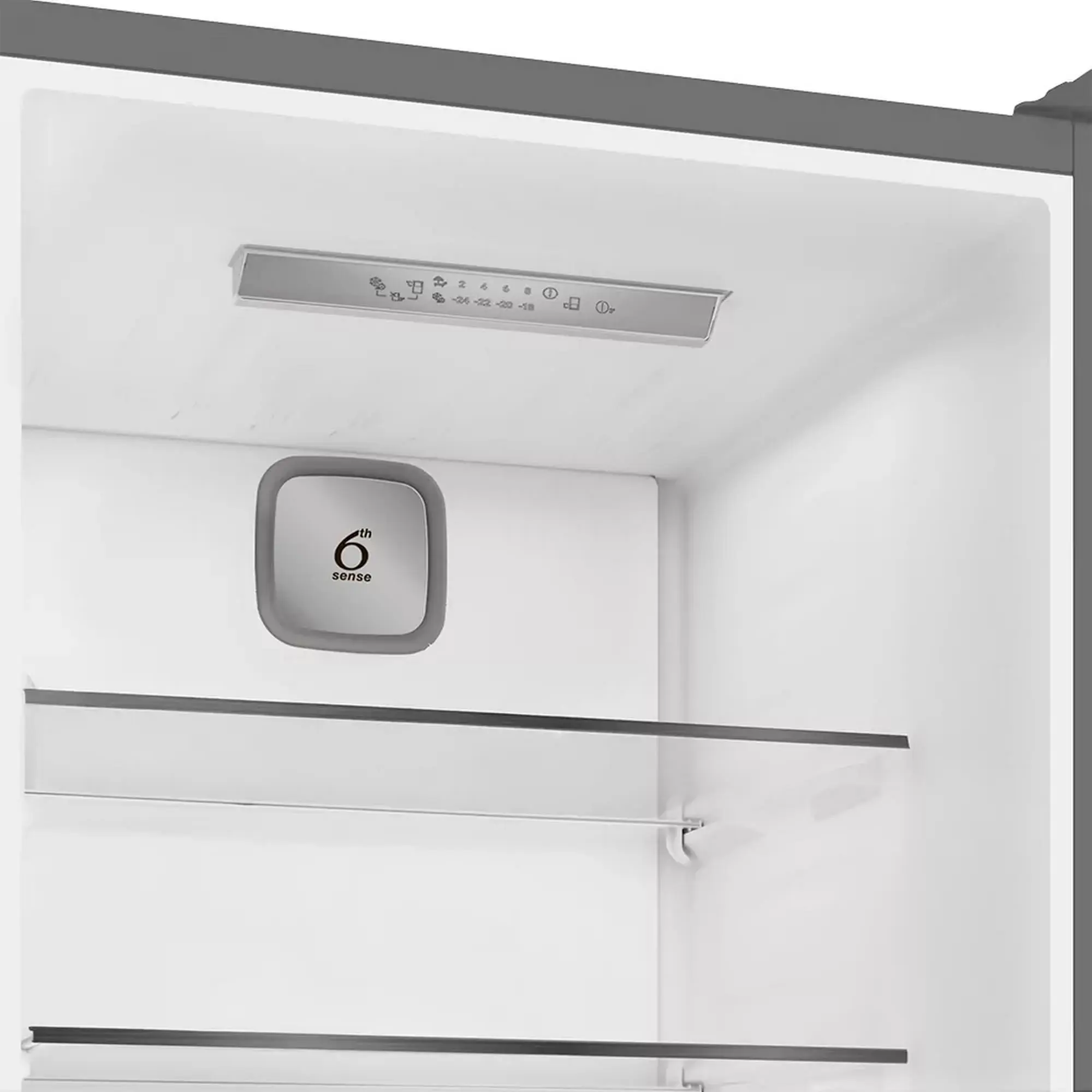 Двокамерний холодильник об'ємом 355 л оснащений інверторним компресором і технологією повного No Frost для зручного зберігання продуктів без інею. Завдяки електронному керуванню та LED-індикації контроль температури максимально простий. Містка холодильна камера має 4 скляні полиці, 2 контейнери для овочів і дверну полицю для пляшок. Морозильне відділення з трьома секціями підтримує автономне збереження холоду до 11 годин.