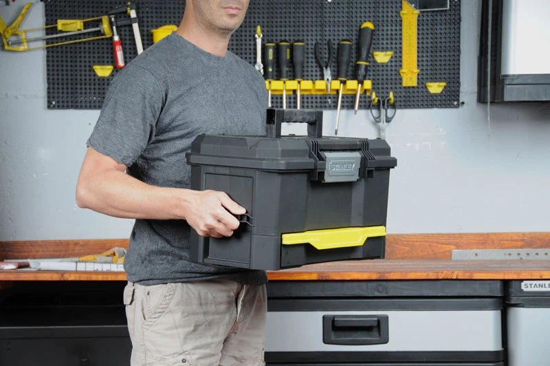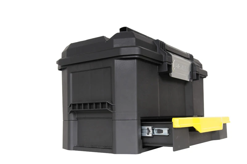 Ящик має один замок і легко відкривається однією рукою, коли інша зайнята. Знімний піддон довжиною 2/3 ящика звільняє простір для великого інструменту. Широка зручна ручка з покриттям з м'якої гуми для зручності і комфорту при перенесенні. Глибока висувна секція для невеликих деталей і інструменту V-подібний паз в кришці ящика для зручності розташування деталі при пилянні. Отвори для навісного замка для захисту вашого інструменту від сторонніх.