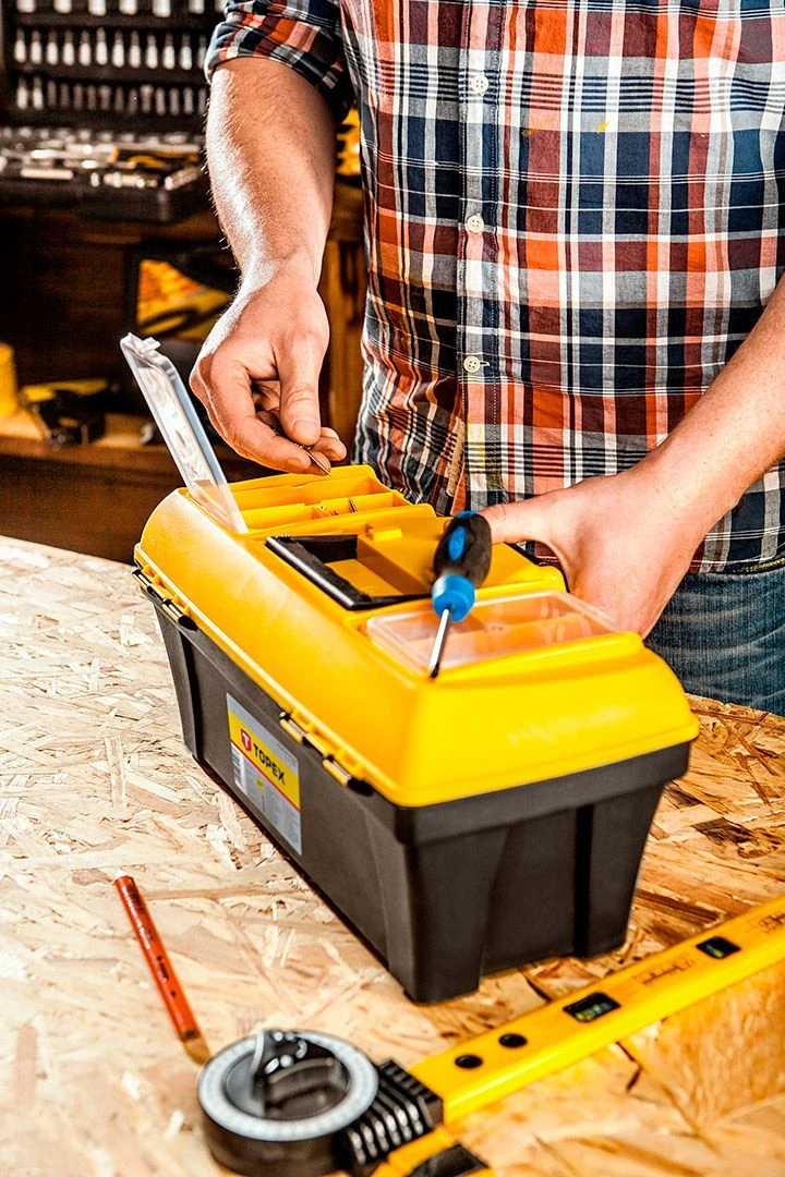 Ящик для інструменту TOPEX - це легкий і зручний ящик для інструменту. Виготовлений з міцної пластмаси. З 2 практичними органайзерами для зберігання дрібних елементів і зручною ручкою для перенесення. Бренд TOPEX призначений для домашніх майстрів.