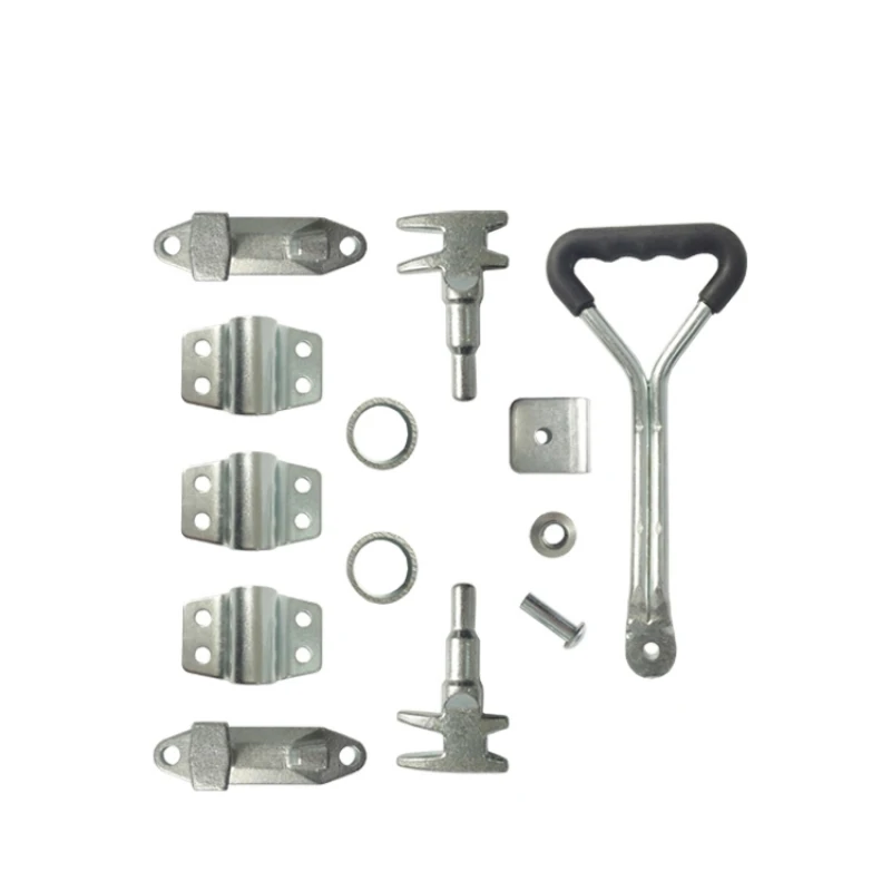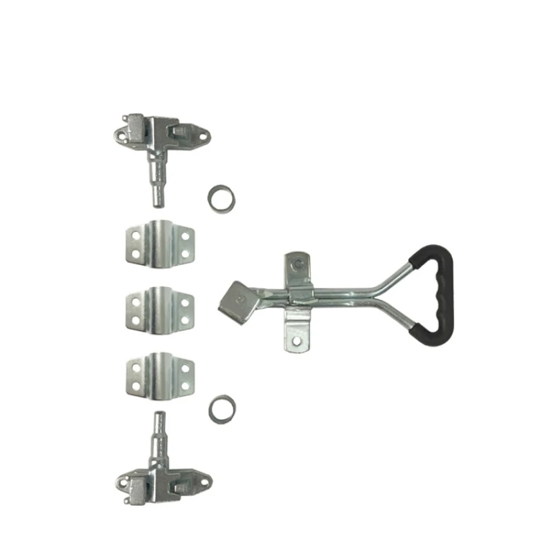 Замок використовується для надійної фіксації дверей напівпричепів, кузовів та металевих контейнерів під час транспортування. Він утримує двері у закритому положенні, запобігаючи випадковому відкриттю, розхитуванню чи перекосу. Підходить для логістичних і транспортних компаній, а також для промислового обладнання з важкими металевими дверима.