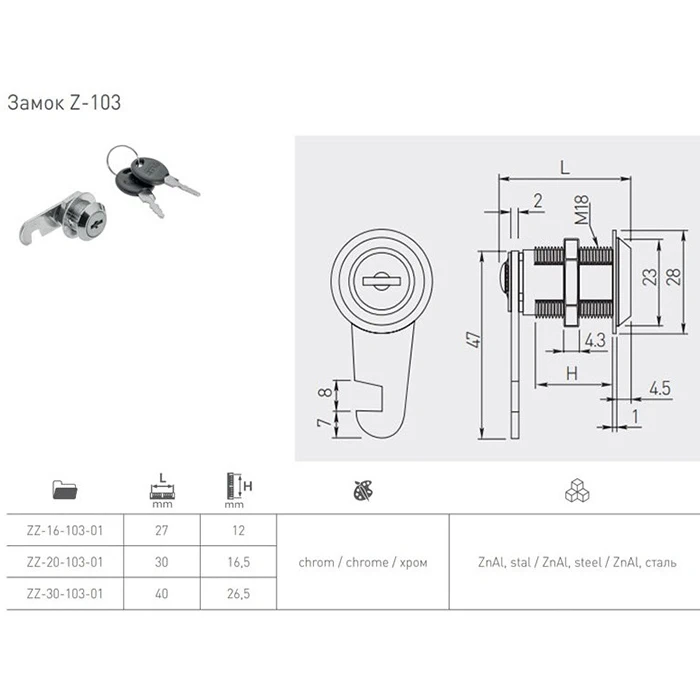 Основне про модель — Замок GTV ZZ-20-103-01-S для ящиків 16,5 мм Хром