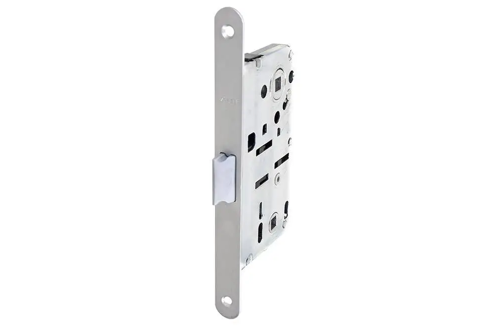 Замок врізний для дверей WC. Врізний, для дверей з фальцем і без фальца. Універсальний: правий і лівий. Матеріал: Лицьова планка: сталь, колір / покриття: хромована матова. Ригель з пластмаси забезпечує безшумне закриття дверей, без металевого дзвону. Розмір під чотиригранний штифт дверних ручок: 8 х 8 мм. Ширина лицьової планки врізного замка: 18 мм. Висота лицьової планки врізного замка: 196 мм. Глибина врізки замка: 75 мм. Ригель замка: для закриття і відкриття замка потрібно один оборот. Монтаж шляхом врізання.