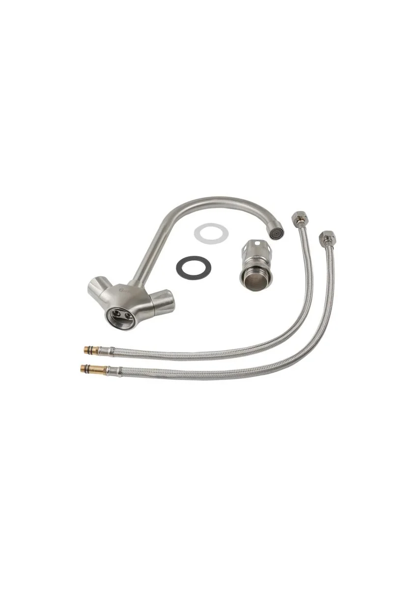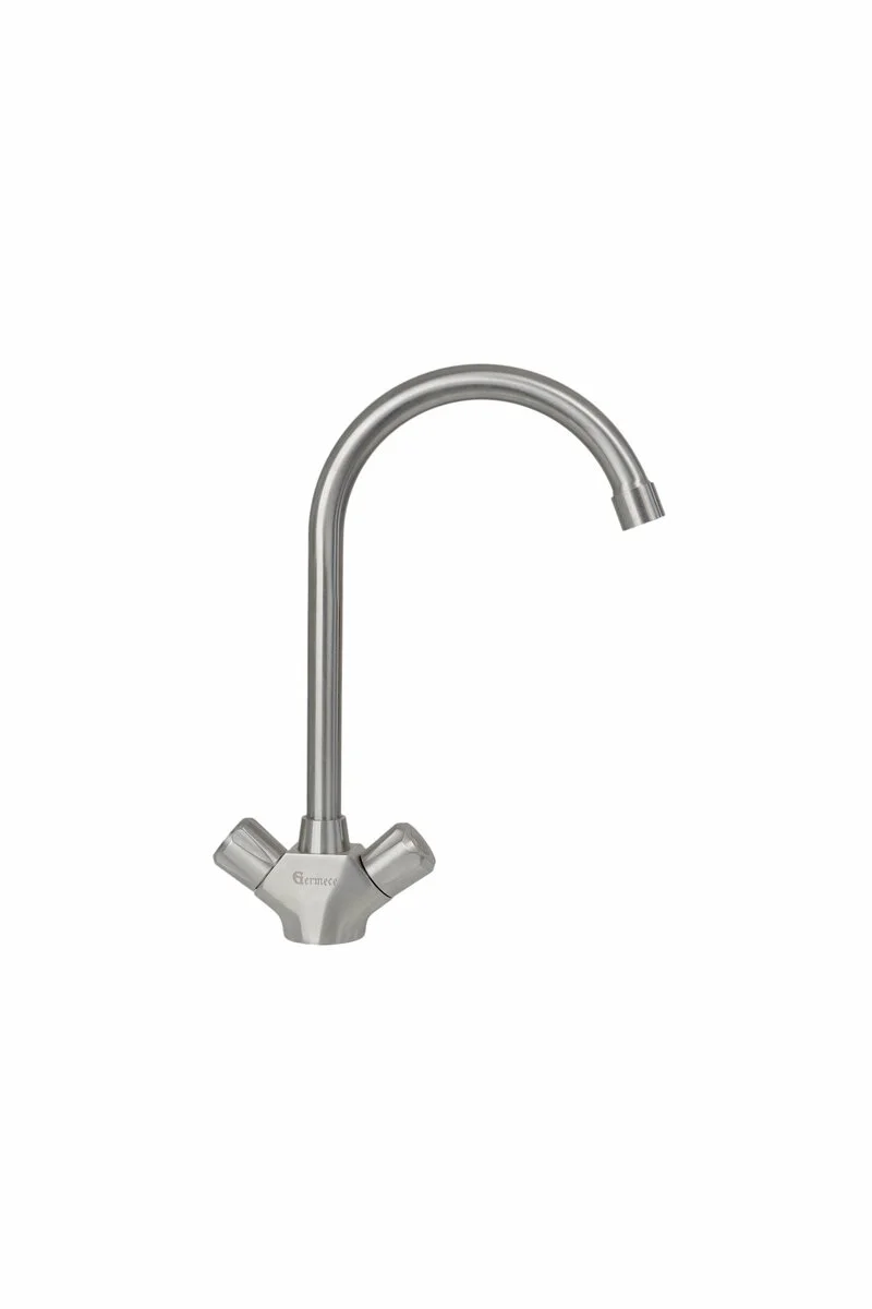 Кухонний двовентильний змішувач Germece добре поєднується з сучасним дизайном кухонних мийок. Він має поворотний вилив, що забезпечує зручне миття посуду, наповнення місткостей, миття овочів і рук.