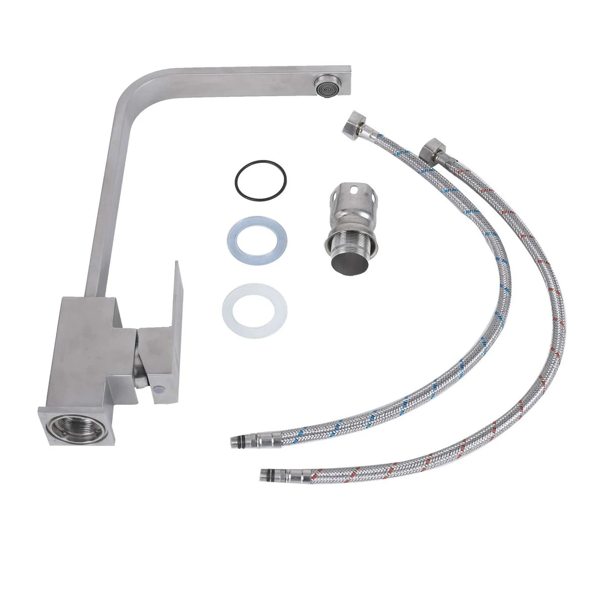 Два шланги довжиною 50 см дозволяють легко приєднати змішувач до водопроводу. Комплектація включає шланги, кріплення для змішувача, прокладку та гайки, що спрощує процес монтажу та забезпечує надійну фіксацію.