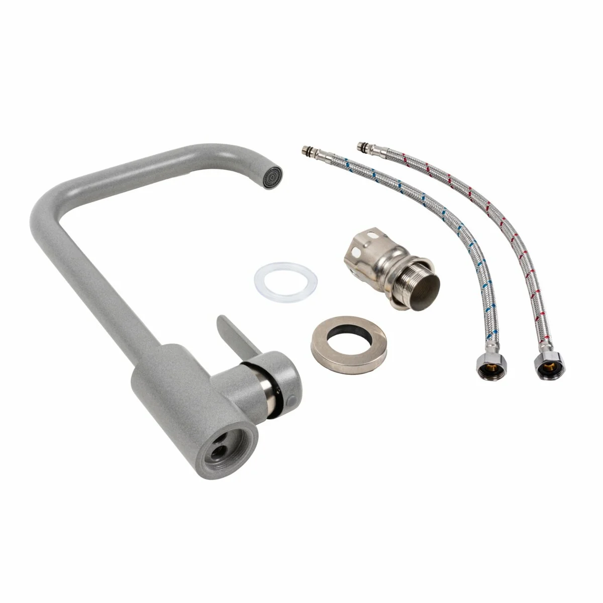 Два шланги довжиною 50 см дозволяють зручно приєднати змішувач до водопроводу. Комплектація включає кріплення для змішувача та прокладки (2 шт), що спрощує монтаж та забезпечує надійну фіксацію.