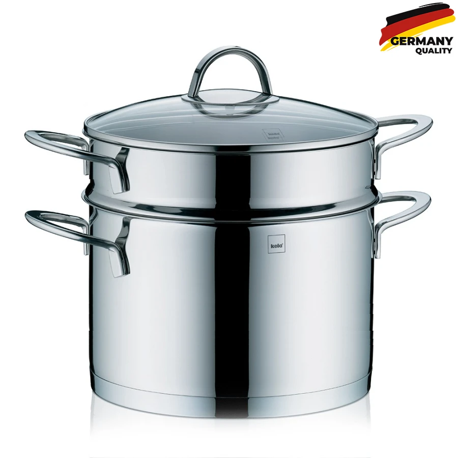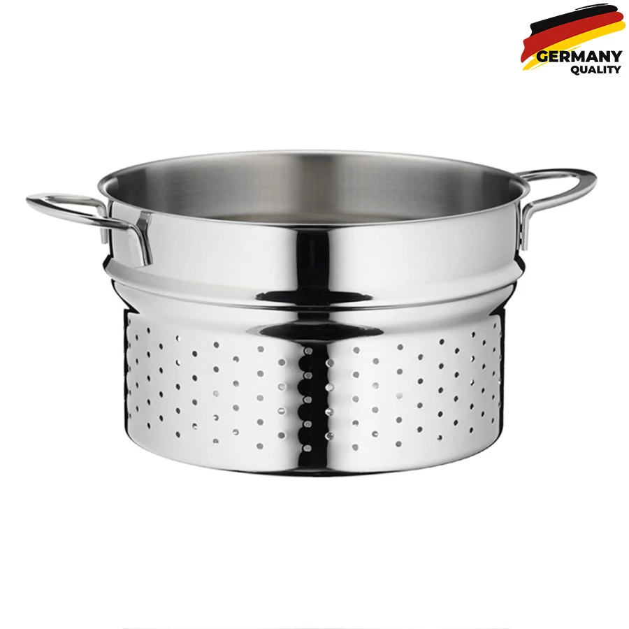 Німецький виробник посуду та начиння для кухні KELA, спеціально для цінителів італійської кухні, представляє стильну nта практичну каструлю для пасти KELA Cailin. Набір складається з трьох предметів - основнрї ємності, кришки та вставної частини з дірками, схожої на глибокий друшляк. Відмінно підійде для приготування пасти, рису та тушкування овочів. Каструля виготовлена з екологічно безпечної, високоякісної нержавіючої сталі 18/10. Така сталь не іржавіє, не окислюється, не деформується при тривалій експлуатації, легко миється та чиститься. У процесі готування можна застосовувати будь-які лопатки або ложки, не боячись зіпсувати внутрішні стінки посуду. Капсульне дно забезпечує рівномірний розподіл тепла. Вставна частина забезпечує легкий злив води після приготування, знижує ризик обпектися. Скляна кришка міцно прилягає до каструлі і запобігає виходу пари. Модель підходить для всіх видів плит, включаючи індукційні. Всі частини набору можна відмінно пристосувати для різних кулінарних маневрів, використовуючи як разом, так і окремо.