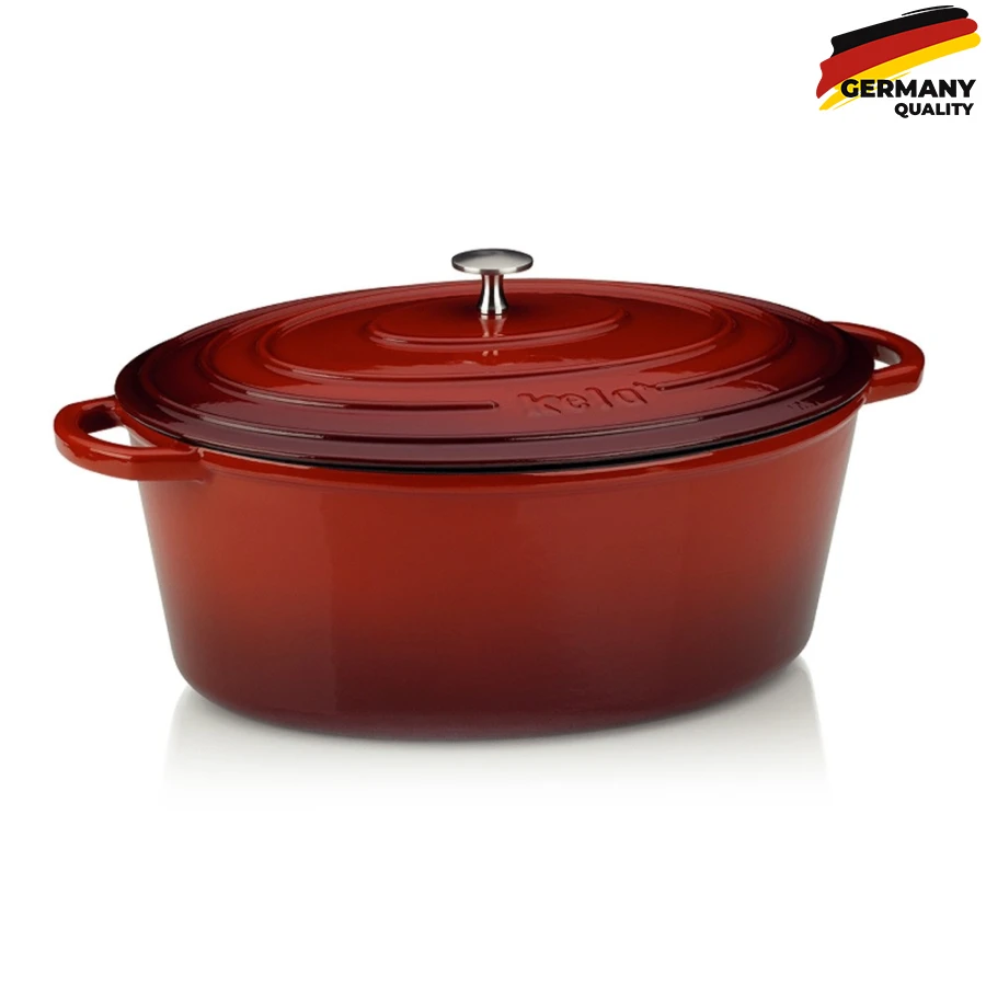 Ексклюзивна чавунна гусятница з кришкою Kela Calido , володіє особливим дизайном - червоне глянсове покриття зовні та емаль бежевого кольору всередині. Переваги цієї чавунної жаровні - дуже гарне акумулювання тепла. Гусятница підходить як для обсмажування (до 300 ° C), так і для тривалого тушкування м'яса у власному соку. З посудом серії Calido, не тільки кухонне начиння стає привабливим, але і результати приготування та смаження.