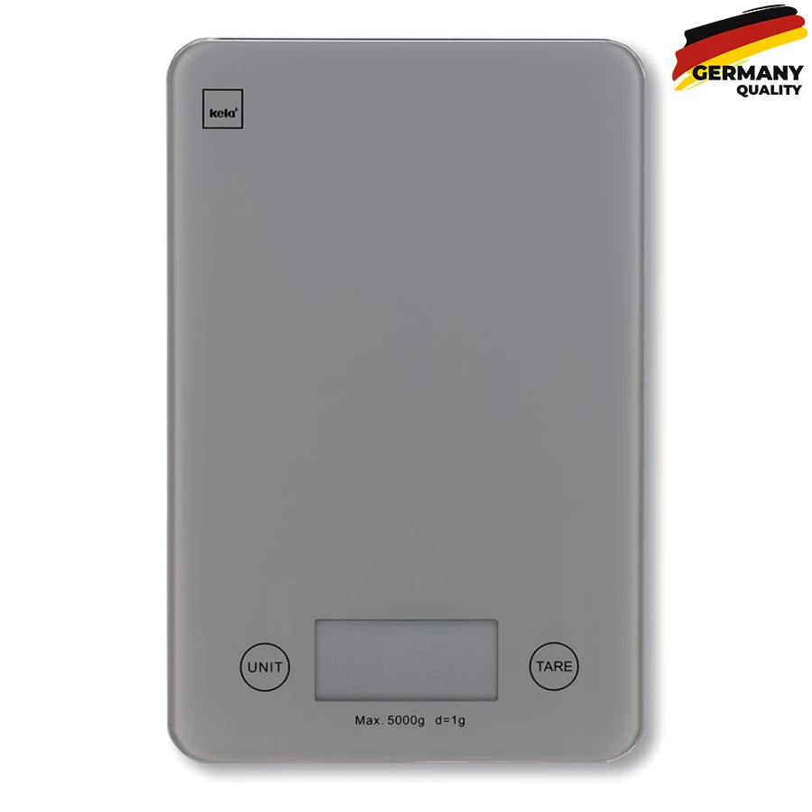 Якісні кухонні ваги KELA PINTA сірого кольору - це те, що вам потрібно. Німецька якість, стильний дизайн, сучасне міцне скло і пластик, тарокомпенсація, великий LCD дисплей, сенсорні клавіші, батарейка в комплекті, індикація перевантаження й заряду батареї, автовідключення. При незначних розмірах, ваги дозволяють вимірювати продукти вагою до 5 кг при мінімальній похибки в 1 г. Працюють з тарою із будь-якого матеріалу. Платформу можна легко очистити завдяки тому, що вона виготовлена зі скла.