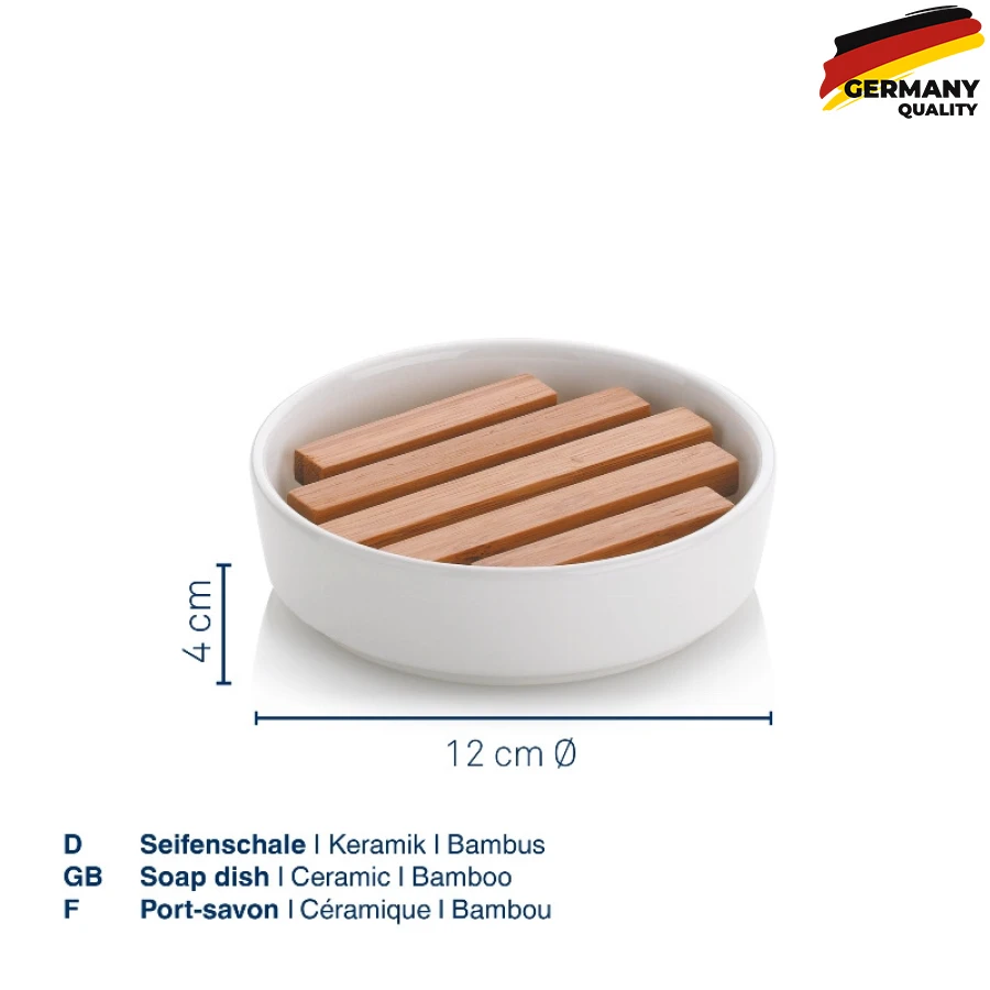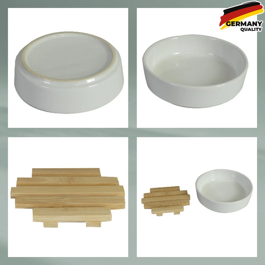 Кругла керамічна мильниця має всередині точно підігнану мильницю, що знімається, зроблену з декількох невеликих шматочків бамбука.