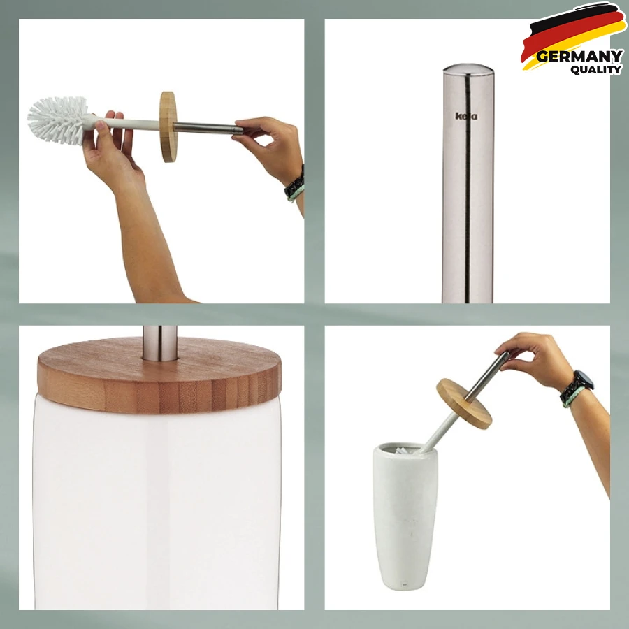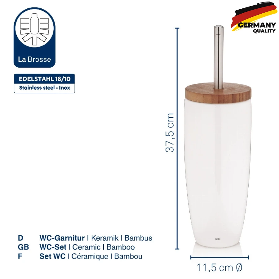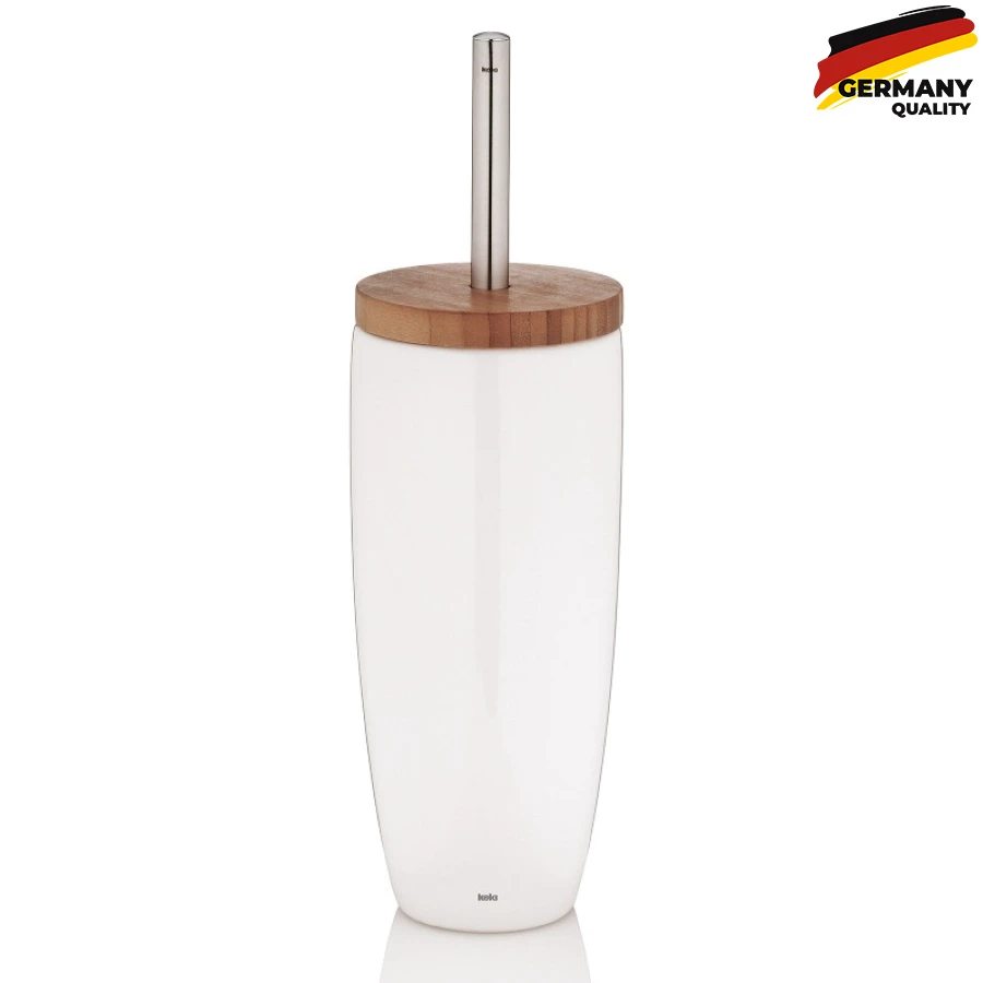 Круглий контейнер виготовлений з легкої у догляді білої кераміки. Ручка йоржика для унітазу виготовлена з нержавіючої сталі і надає керамічного унітазу елегантного вигляду. Його можна відкрутити від білої пластикової ручки щітки.