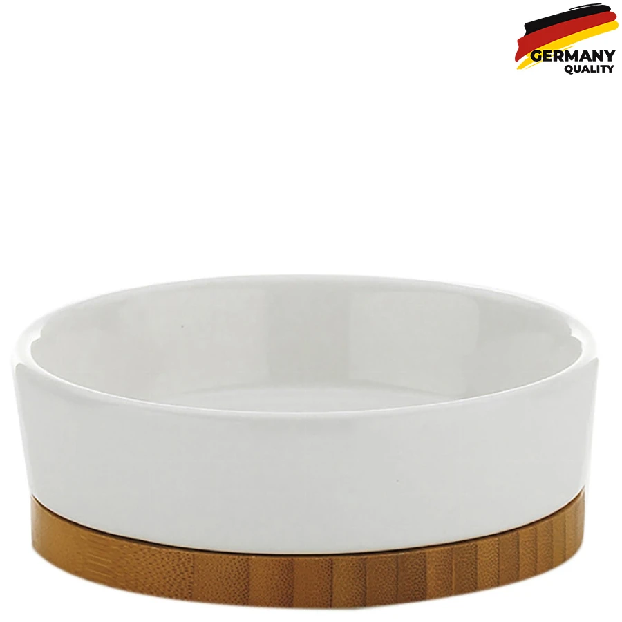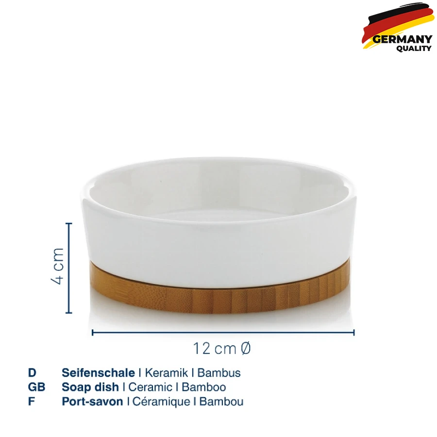 Корисна мильниця виготовлена з білої, простої у догляді кераміки. Клеєна основа круглої мильниці виготовлена з бамбука.