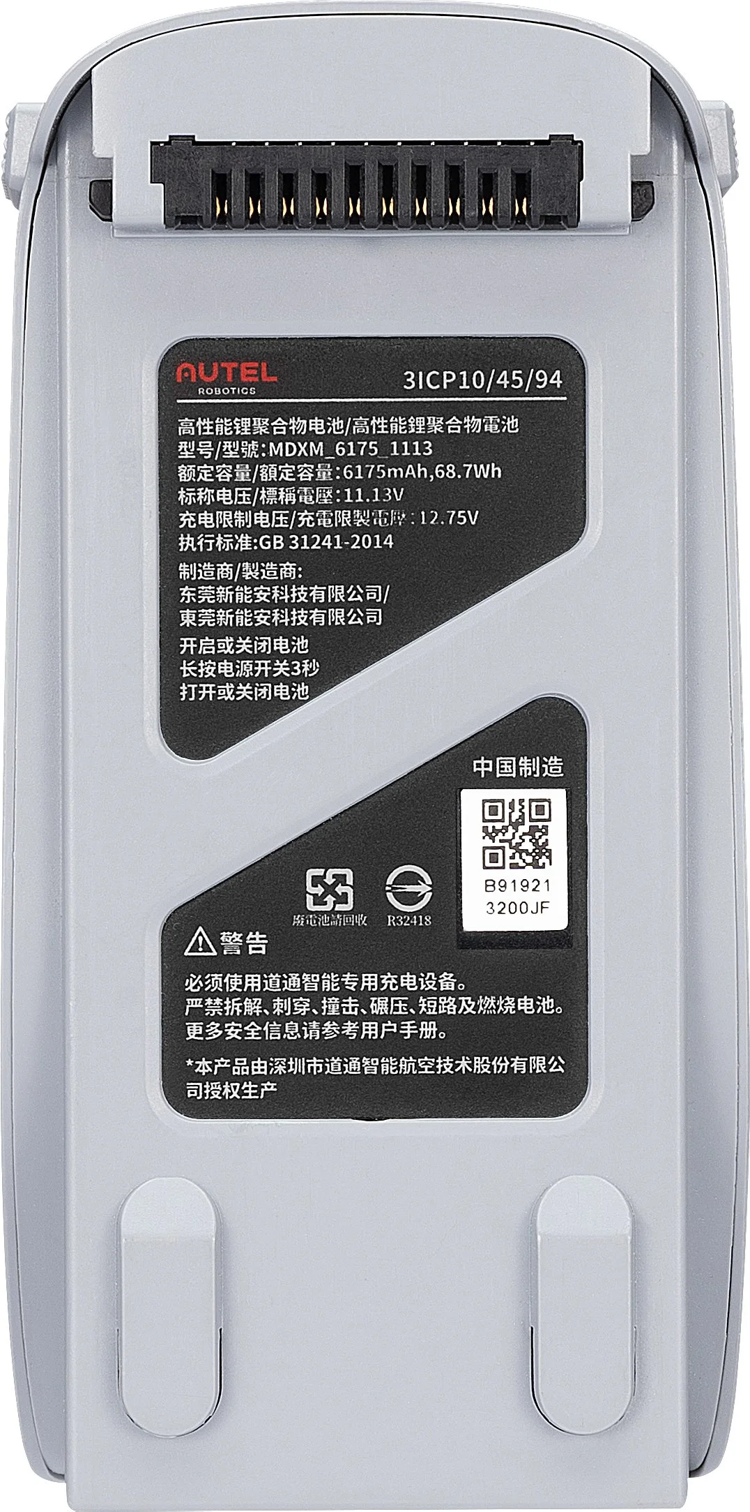 Швидкозмінний літій-полімерний акумулятор EVO Lite ємністю 6175 мАг і напругою 11,13 В забезпечує до 40 хвилин польоту. Акумулятор доступний у кольорах Autel Orange і Deep Space Gray, щоб підходити до вашого дрона EVO Lite.